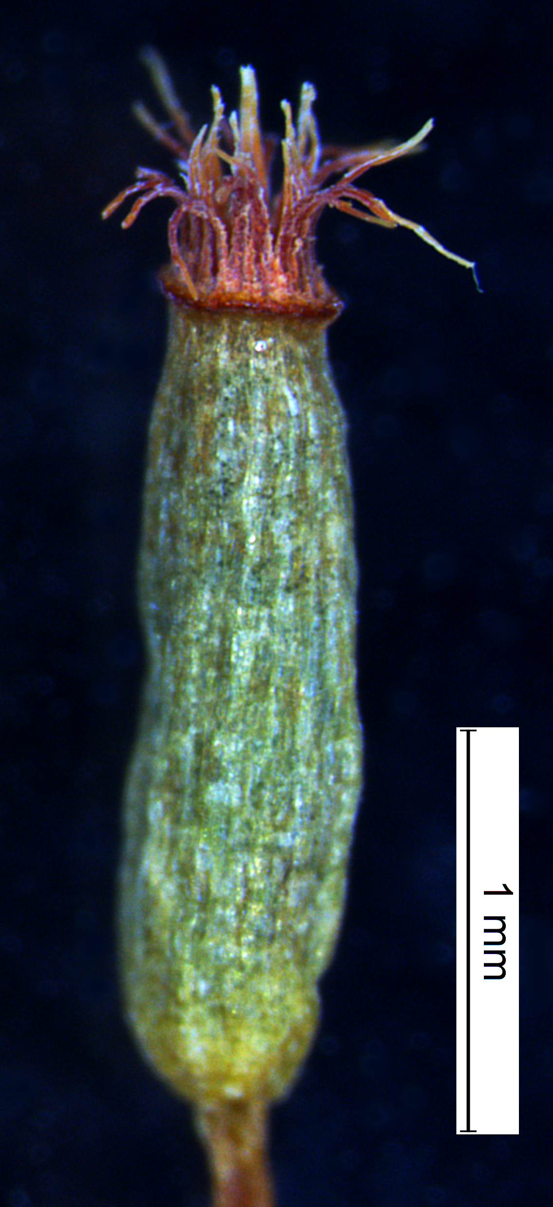 Sporehus med lange røde peristomtenner og tydelig striert overflate.