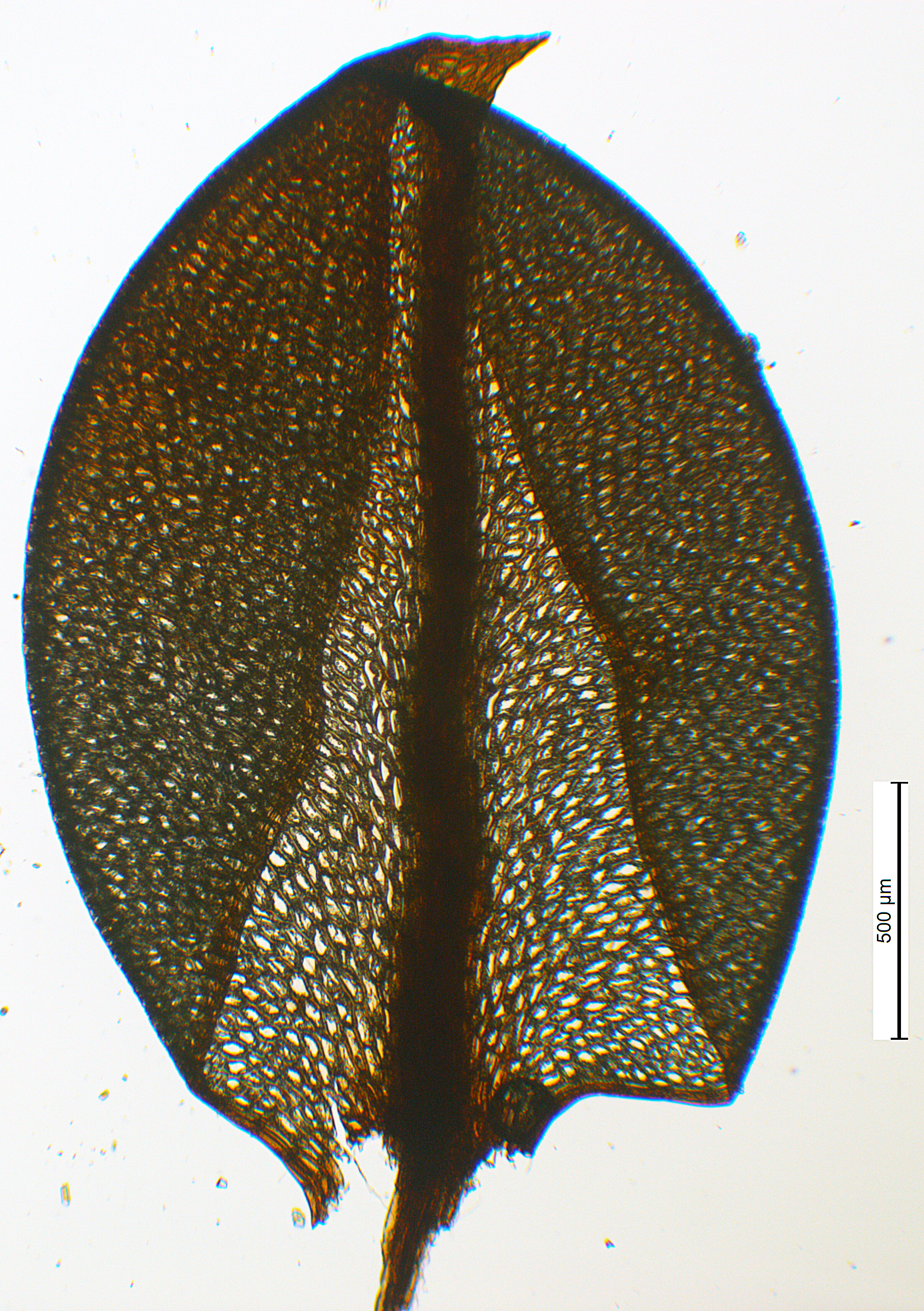 Bladkanten er kraftig nedbøyd på begge sider, slik at bladet får en hetteaktig form. Nerven er kraftig og bladet ender i en tydelig spiss.