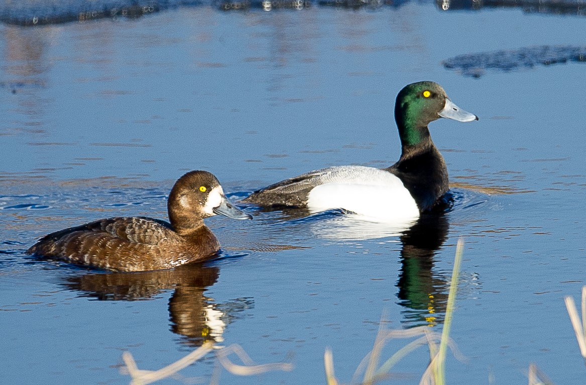 Et bergandpar på hekkeplassen under isløsningen. Hannen (til høyre) i praktdrakt (under paringstiden) er sterkt kontrastfarget med hvite flanker, gråvatret rygg og ellers svart kropp. Hodet er grønnsvart og øynene er gule. Hunnene (til venstre) har en brunlig kropp i ulike nyanser, store, hvite partier rundt nebbrota og ofte en lys flekk på kinnet bak øyet.