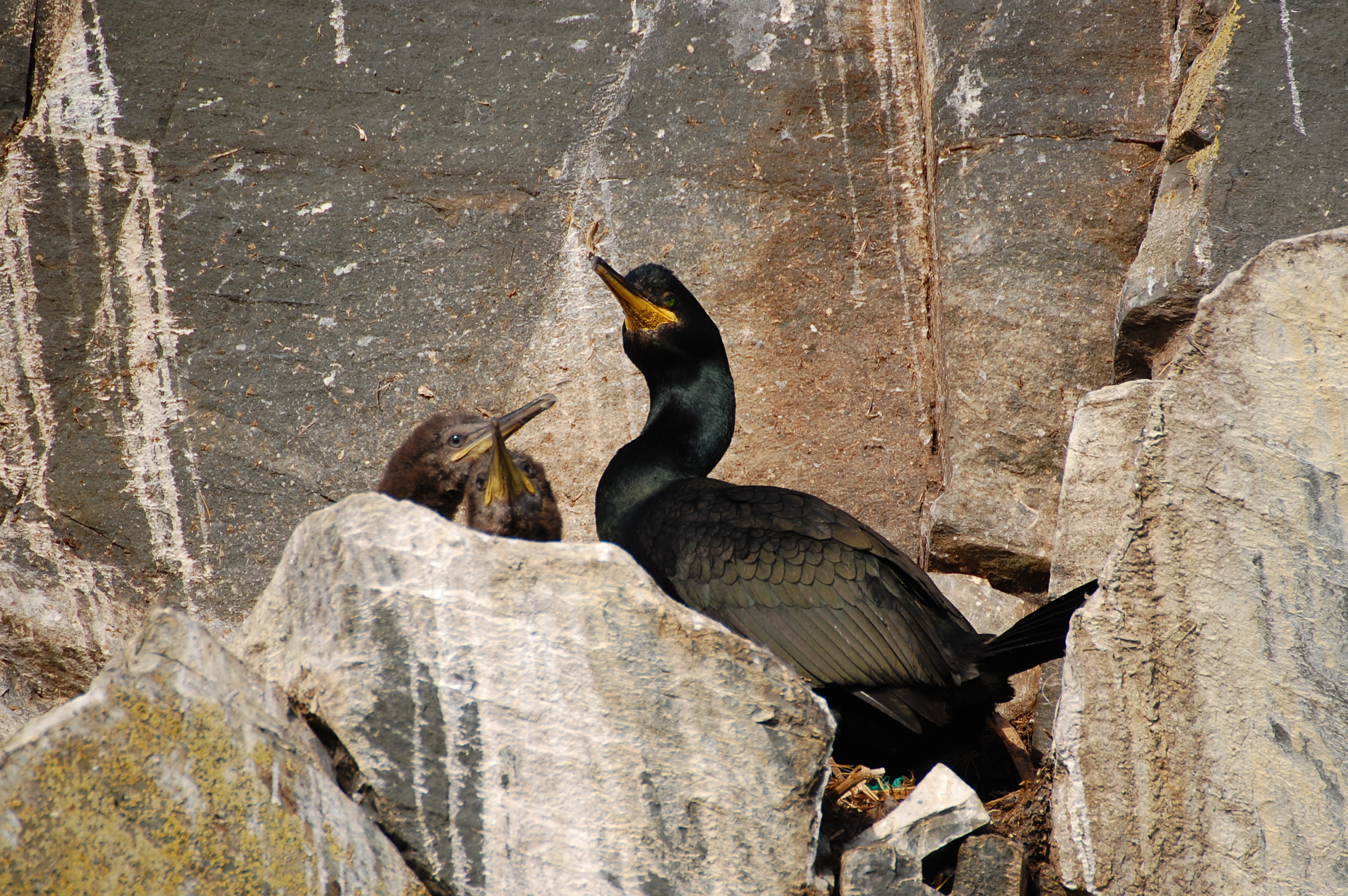 Toppskarven har irrgrønne øyne og en gul basis ved nebbroten. Reiret plasseres ofte skjult i steinur.