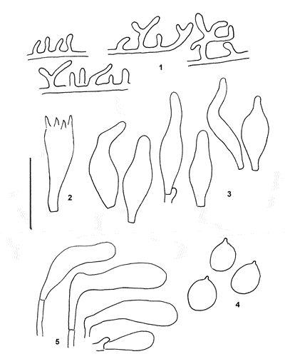 1. Hatthudshyfer, 2. Basidium, 3. Cheilocystidier, 4. Sporer, 5. Caulocystidier.
