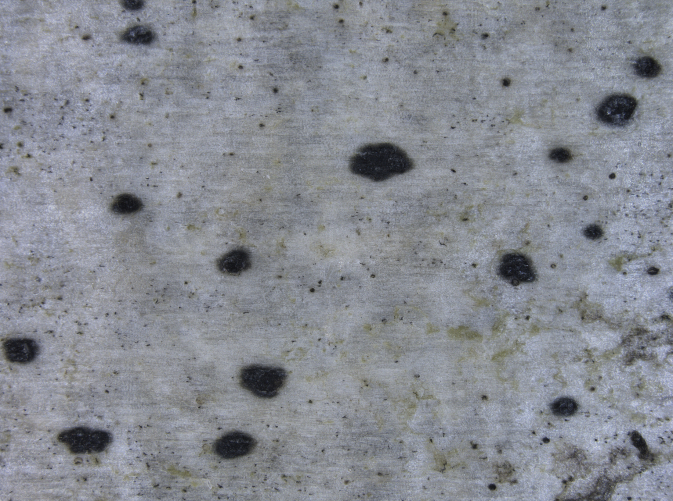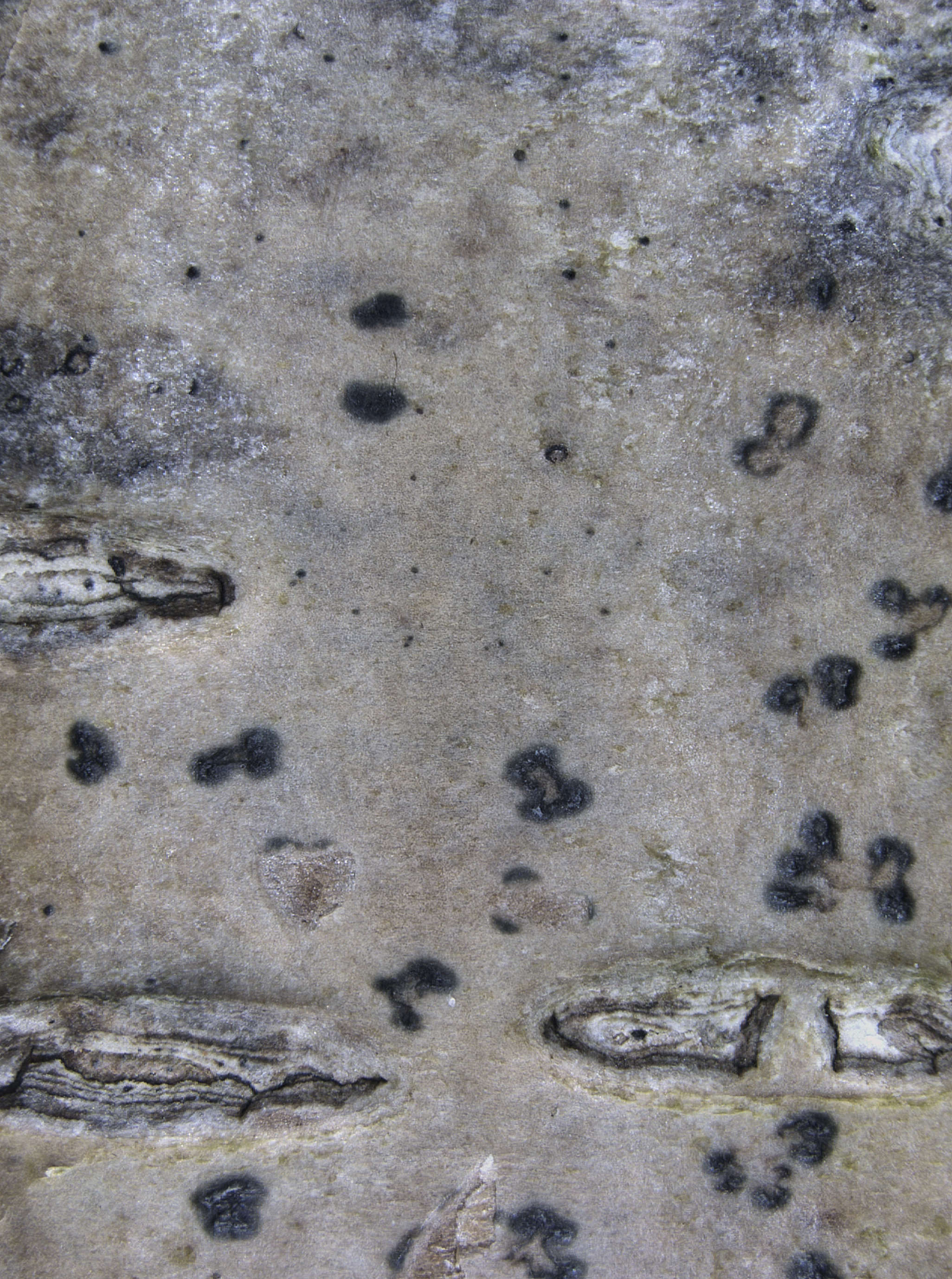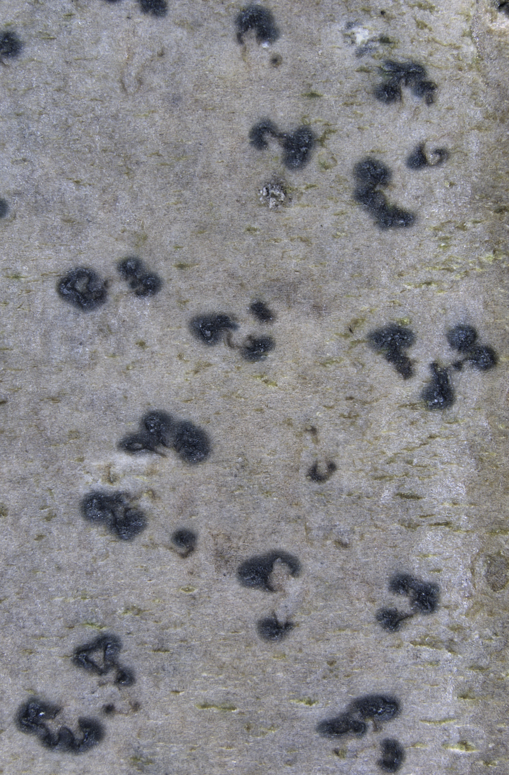 Fruktlegemene er avrunda, litt kantete eller avlange, av og til nesten bladforma eller stjerneforma. De er brunsvarte uten rimaktig belegg. Fruktlegemene er flate eller svakt konvekse og ligger i samme nivå som tallusoverflata eller svakt opphøyde. De er ca 0,3–1,2 x 0,1–0,7 mm store og 80–120 µm høye.