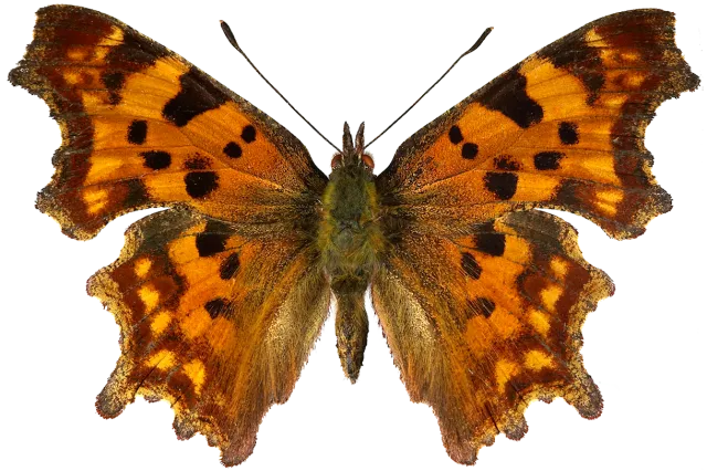 Vingeoversiden er oransjebrun med mørkebrune tegninger. Vingekanten er sterkt fliket. Undersiden er i brune sjatteringer og minner om bark. Midt på bakvingeundesiden er det en hvit c-formet figur som har gitt opphav til artens norske og vitenskaplige navn. Arten er lett gjenkjennelig på den kraftig flikete vingekanten.