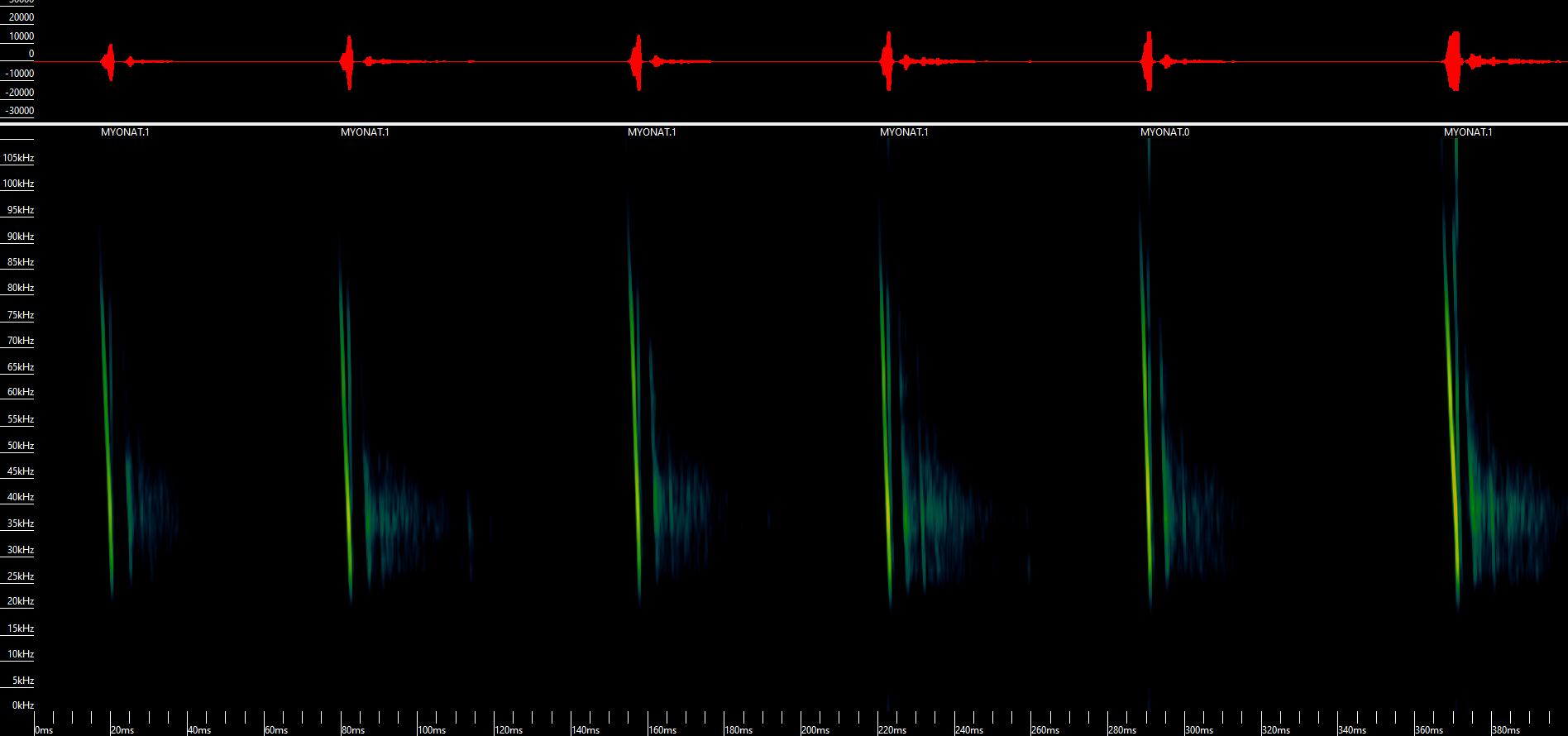 Et eksempelopptak som viser seks ekkolokaliseringsrop fra børsteflaggermus Myotis nattereri, hvor y-aksen viser frekvensene ropet utgis på (kHz), mens x-aksen henspeiler tiden (i millisekunder). I det gitte eksempelet er det flere essensielle komponenter som kan analyseres: ropene ser ut til å starte på forskjellige frekvenser mellom 85–100 kHz. Dette skyldes eksempelvis varierende avstand til mikrofon. Ropene har en høyest desibel ved omtrent 40 kHz, ser ut til å avsluttes på omtrent 20–25 kHz, og varer i omtrent 4 ms. Ropene er etterfulgt av kortere pauser på omtrent 60 ms mellom ropene.