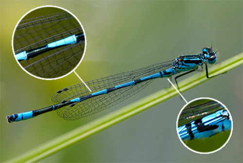Hann av sørblåvannymfe Coenagrion puella. Arten er meget variabel og ligner flere andre arter, især fagerblåvannymfe C. pulchellum. Hannen har svarte sidestreker på flere av bakkroppsleddene og en kraftig U-formet tegning på det andre bakkroppsleddet.