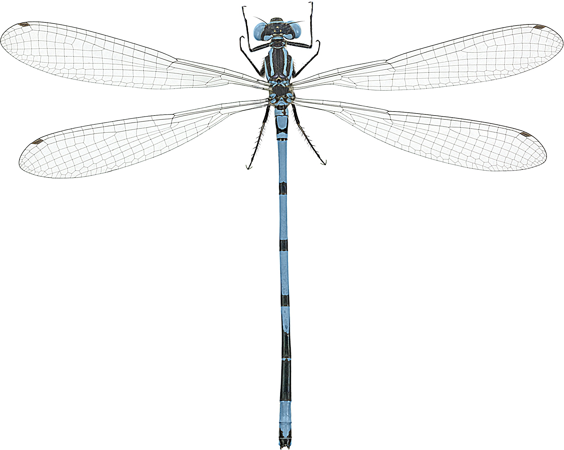 Hannen er svart og blå med blå øyne. De svarte tegningene på bakkroppsleddene er dratt ut i tydelige linjer langs sidene. Hannens andre bakkroppsledd har en U-formet svart tegning (dvs uten "stett"), sjeldnere Y-formet (med "stett") . Hunnen finnes i flere fargevarianter; en gulgrønn, en mørk med kraftige svarte tegninger, og en blå og lysere variant.