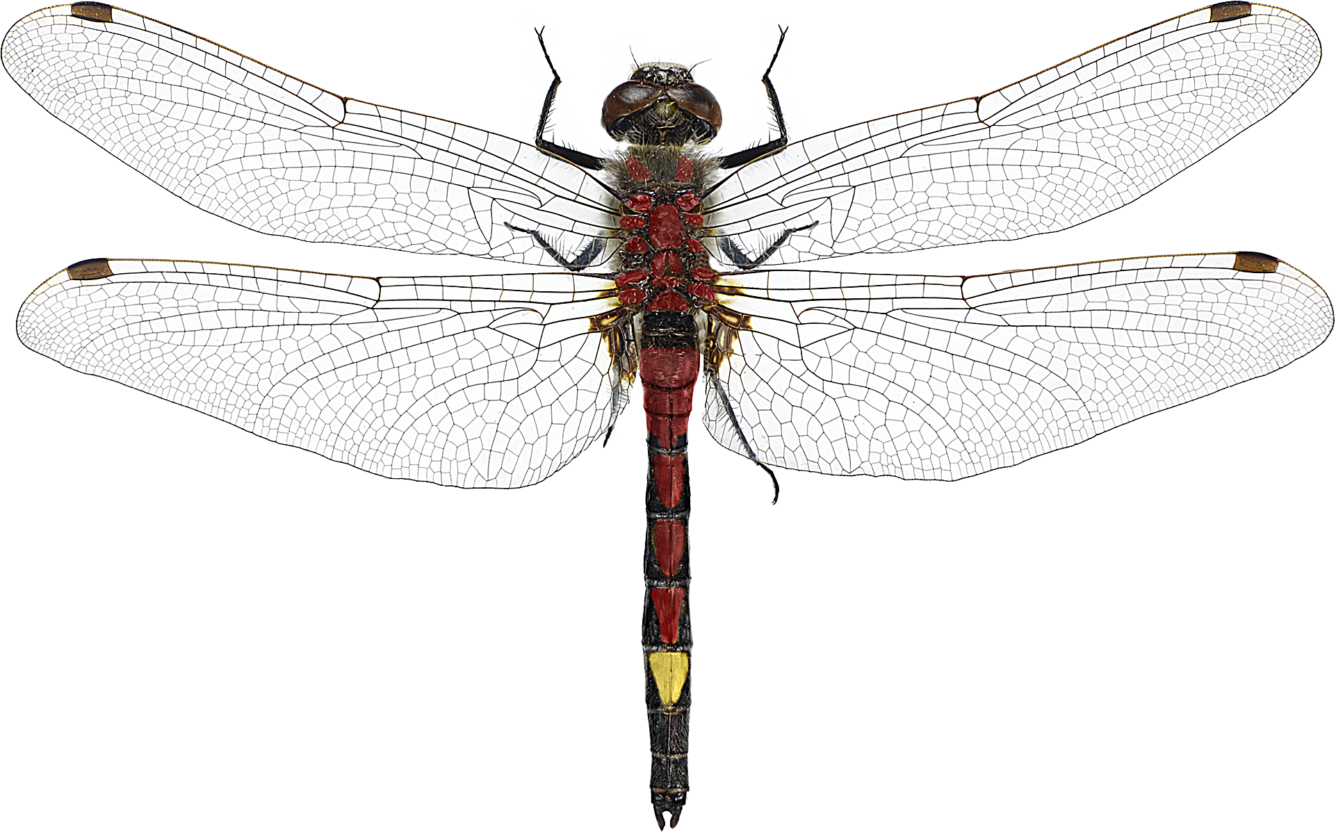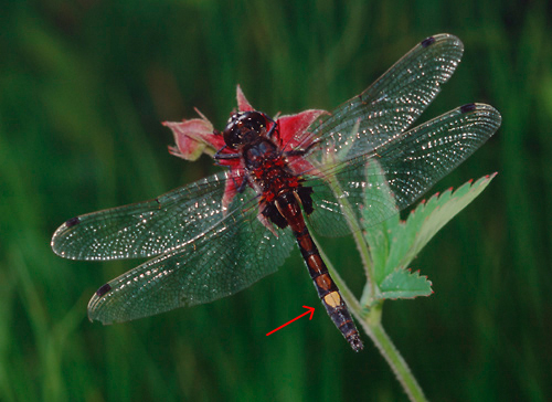 Hunn av gulflekktorvlibelle Leucorrhinia pectoralis. Bakkroppen kan ha mer eller mindre tydelige brune til gule flekker på ledd 1-6, men den gule flekken på ledd 7 er som regel alltid lysere enn de øvrige.
