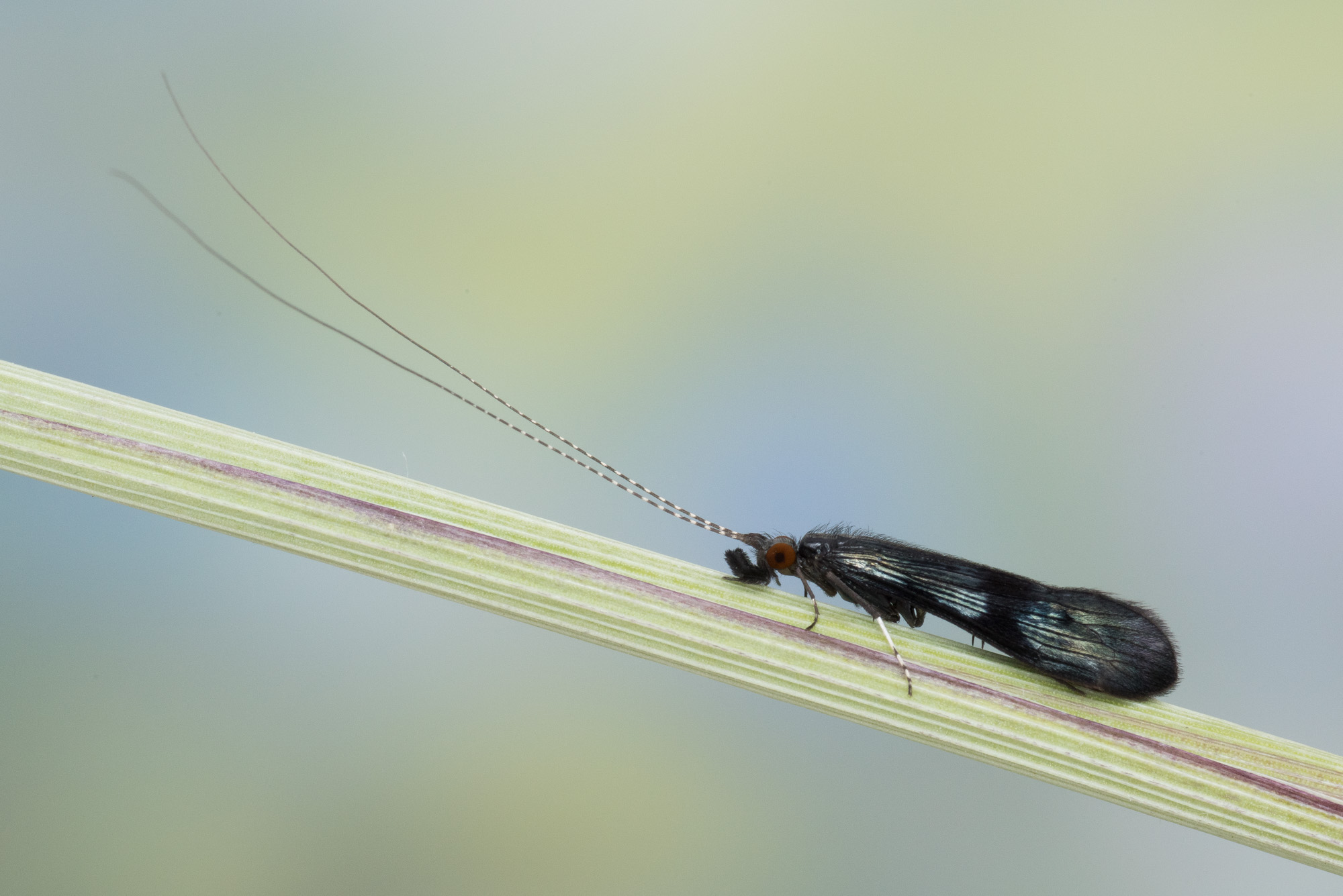 Mystacides azurea er en liten vårflue med smale, skinnende blåsvarte framvinger. Arten er utbredt over hele landet. Larven lever på sand- og mudderbunn i bekker, elver, dammer og sjøer. Den bygger et rett eller svakt buet, portabelt hus av sandkorn og små pinner, barnåler eller andre plantedeler.