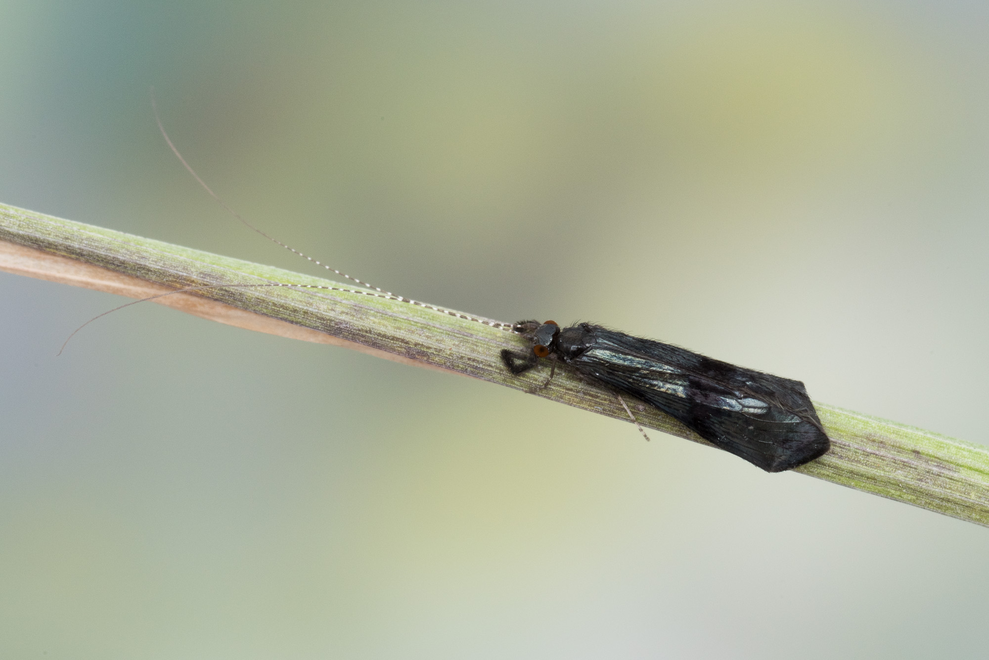Arten er vanligvis lett å kjenne igjen på de skinnende blåsvarte framvingene og på den karakteristiske hvilestillingen med tuppene av framvingene bøyd innover. Slitte individer kan forveksles med Mystacides nigra eller med mørke individer av Athripsodes aterrimus, men arten kan skilles fra disse på at framvingens framkant har et lite hakk nær vingespissen. For sikker bestemmelse bør man undersøke genitaliene.