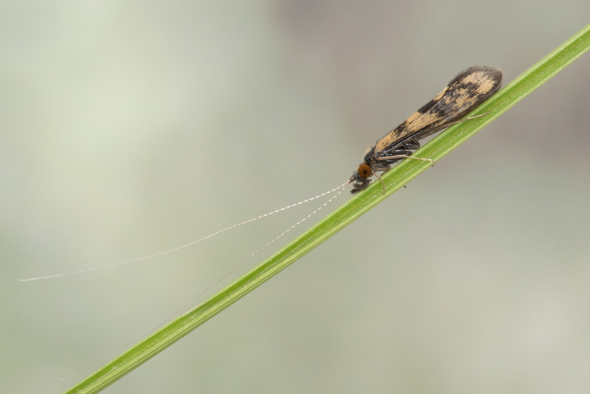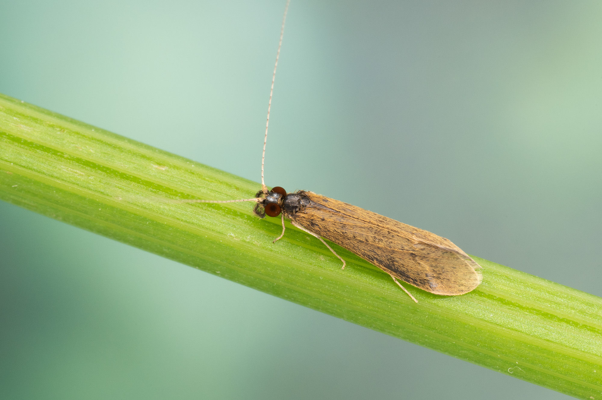 Mystacides longicornis er en liten vårflue med smale, vanligvis mørkebrune framvinger med brede gule tverrstriper. Arten er utbredt på Sør- og Østlandet og er funnet spredt nord til Finnmark. Larven lever på sand- og mudderbunn i bekker, elver, dammer og sjøer, ofte blant vegetasjon eller død ved. Den bygger et rett eller svakt buet, portabelt hus av sandkorn og små pinner, barnåler eller andre plantedeler.