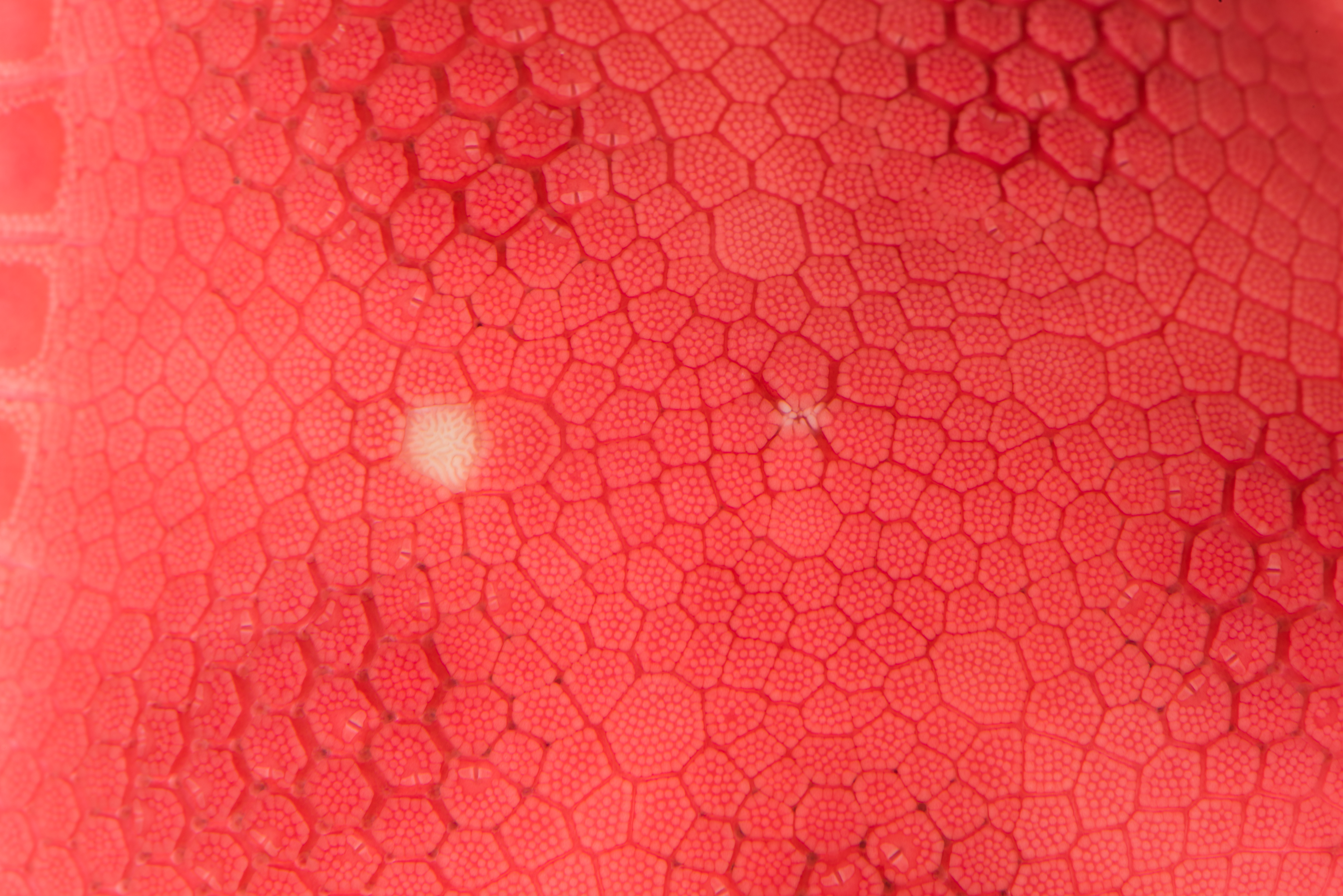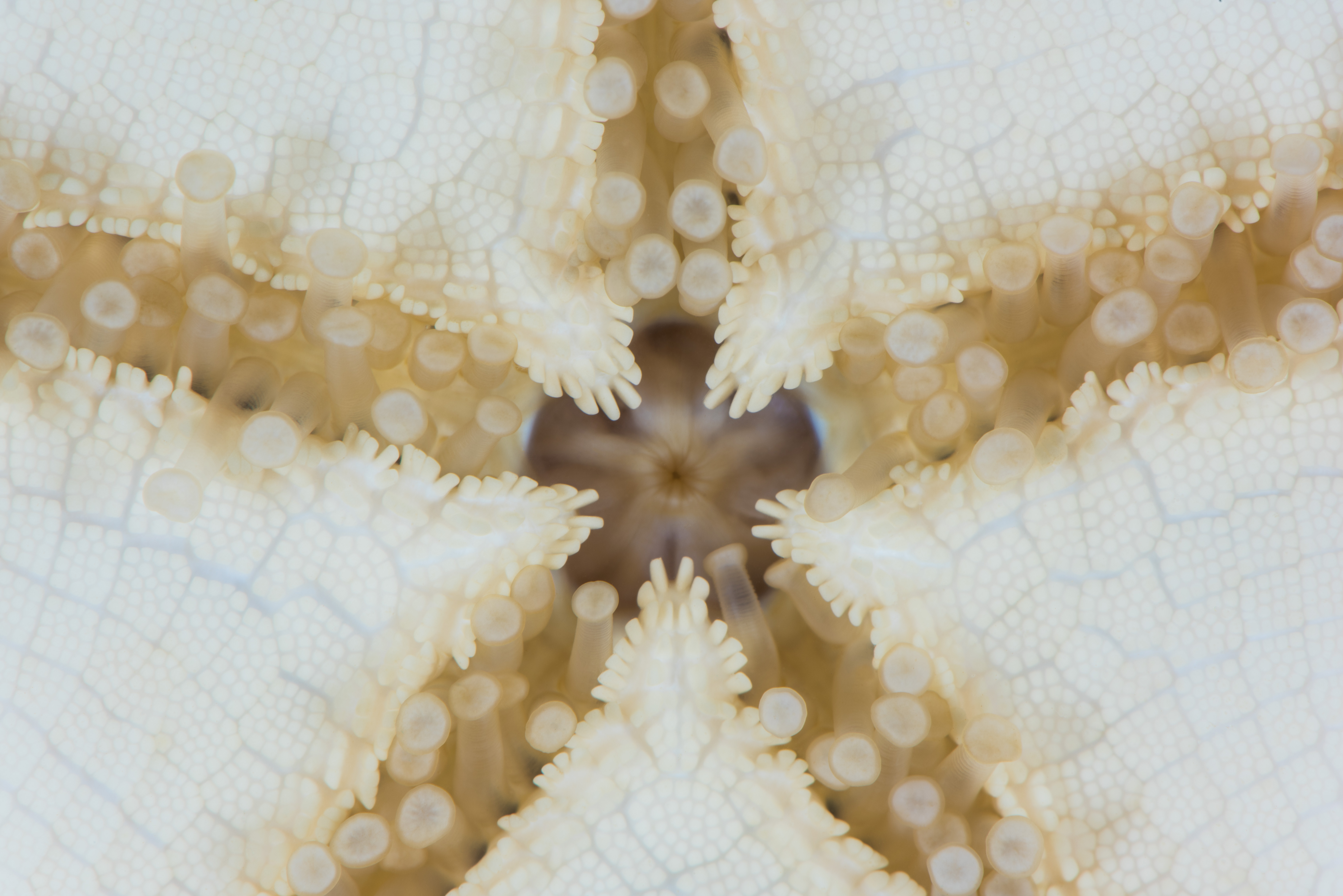 Arten er rødorange på oversiden, og gulhvit på undersiden. Den har ikke så lange armer som mange andre arter har, men ser mer ut som en femkantet plate, eller ”kjeks”. De konvekse, små platene som dekker hele oversiden er dekket med 35-45 korn per plate. De markante marginalplatene har også korn, men med noen nakne områder. Marginalplatene som sitter nærmest midten er ofte bredere enn de er lange, mens det motsatte er tilfelle for platene som sitter lengst ute i armen. På undersiden, i furen med sugeføttene, sitter det 2-4 furepigger per plate. Det er 6-7 munnpigger. Gripetengene, hvis tilstede, ser ut som avlange korn. Arten blir ca. 8 cm i diameter.