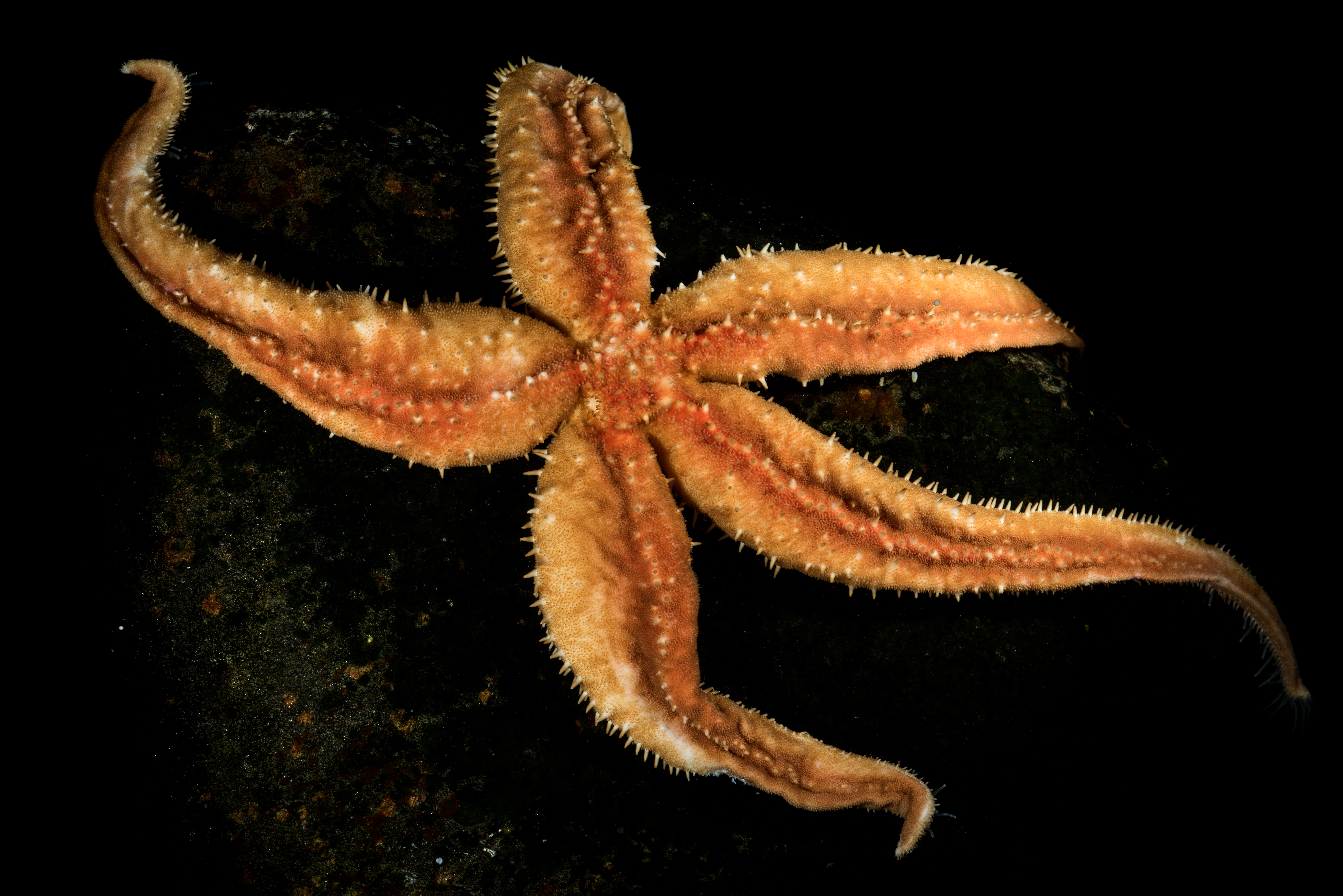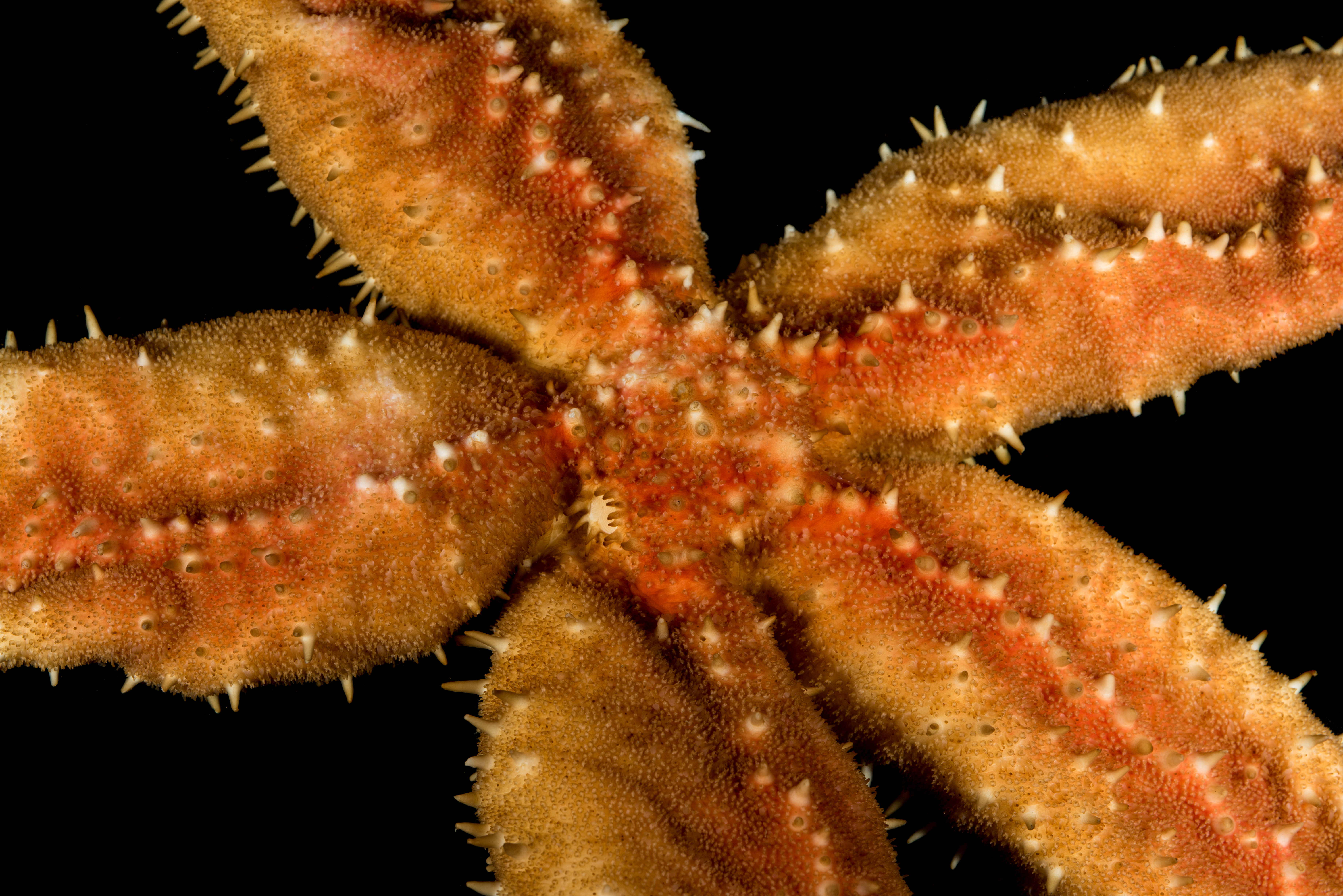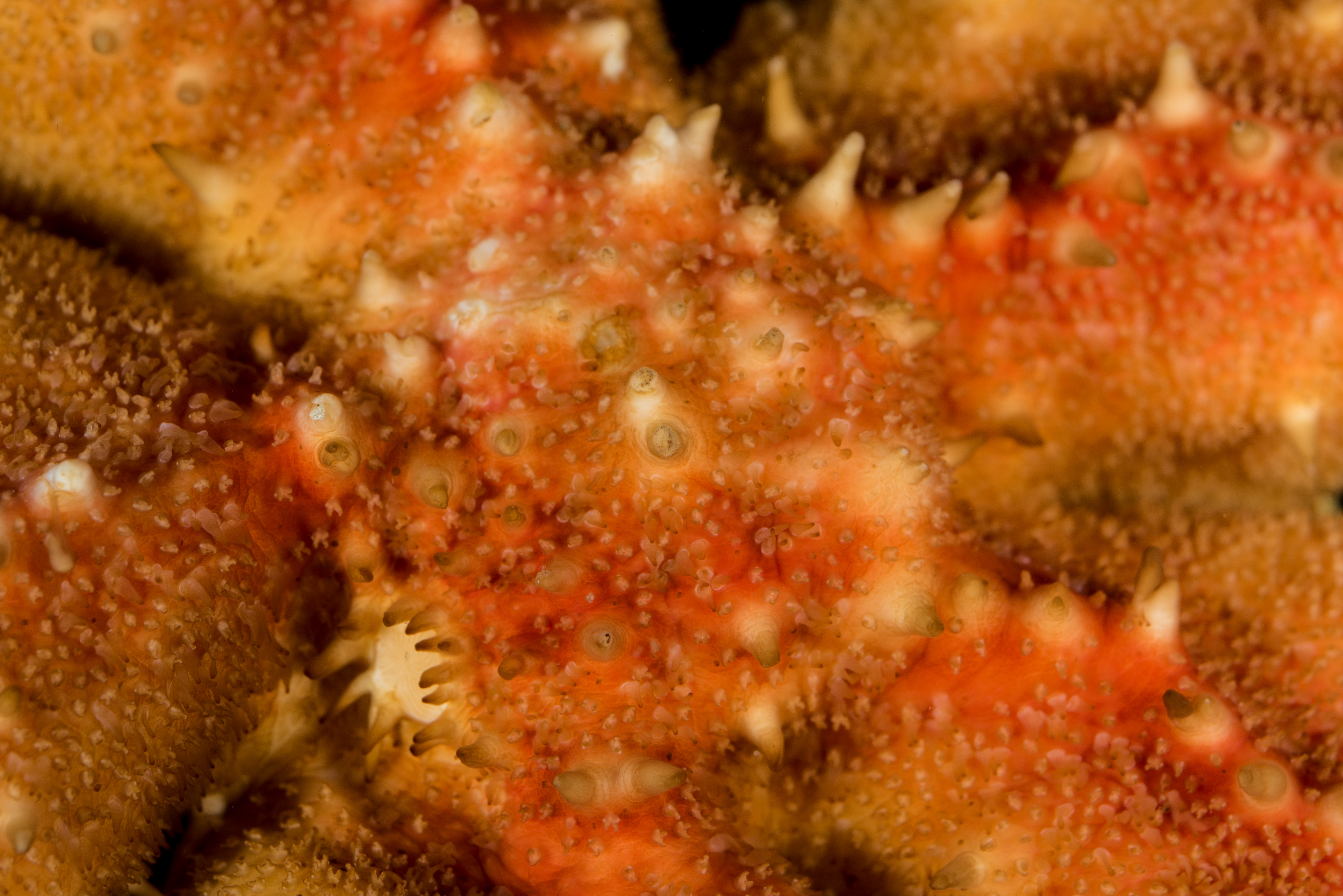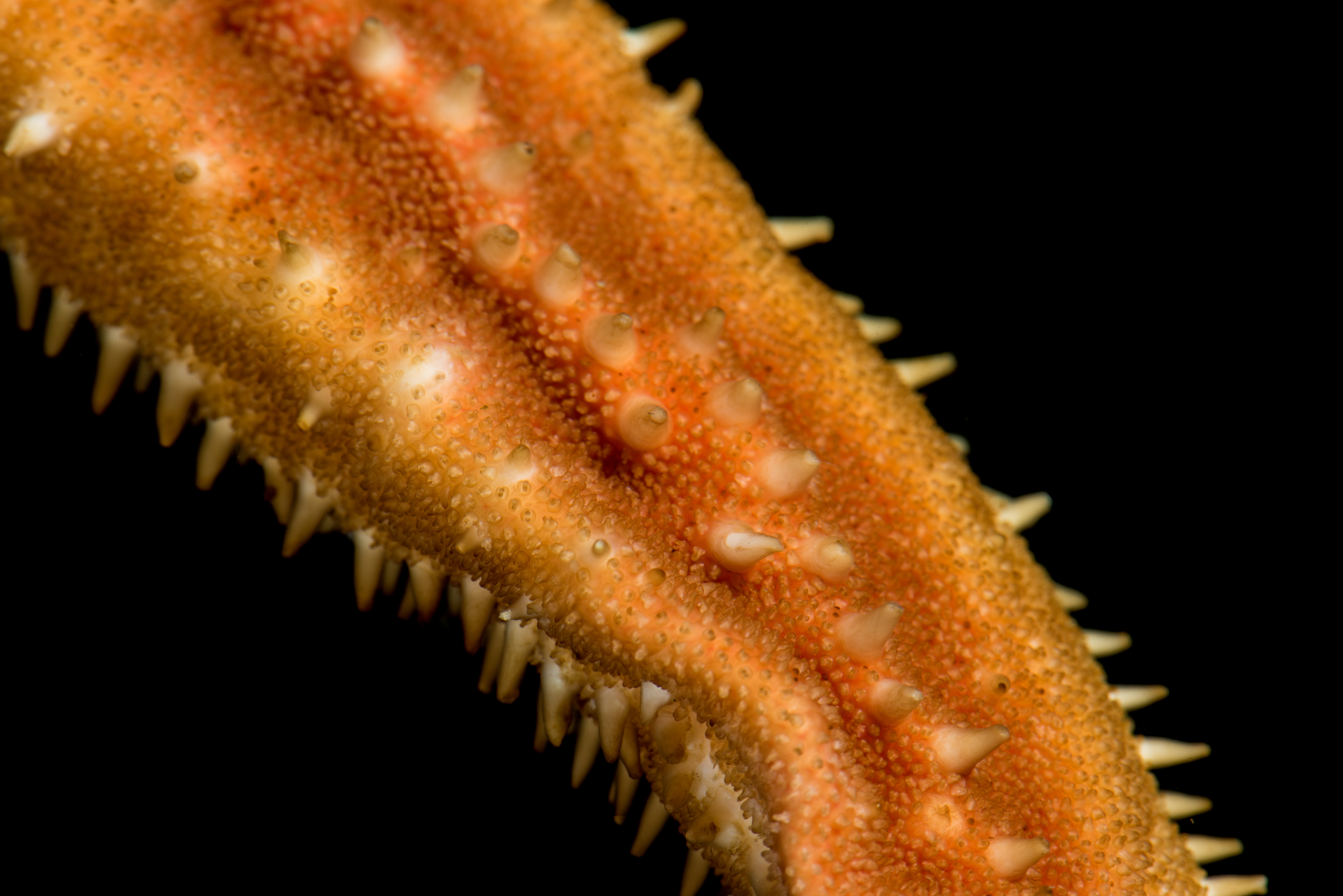 Rød på oversiden og hvitaktig under. Den har lange armer i forhold til skiven. En markant, rettlinjet rad med pigger går langs midten av armene (carina) på oversiden. Den har også en rekke med større pigger marginalt, som ikke har gripetenger rundt seg. Sugeføtter i 4 rader. Adambulakralen med 3 pigger per plate.