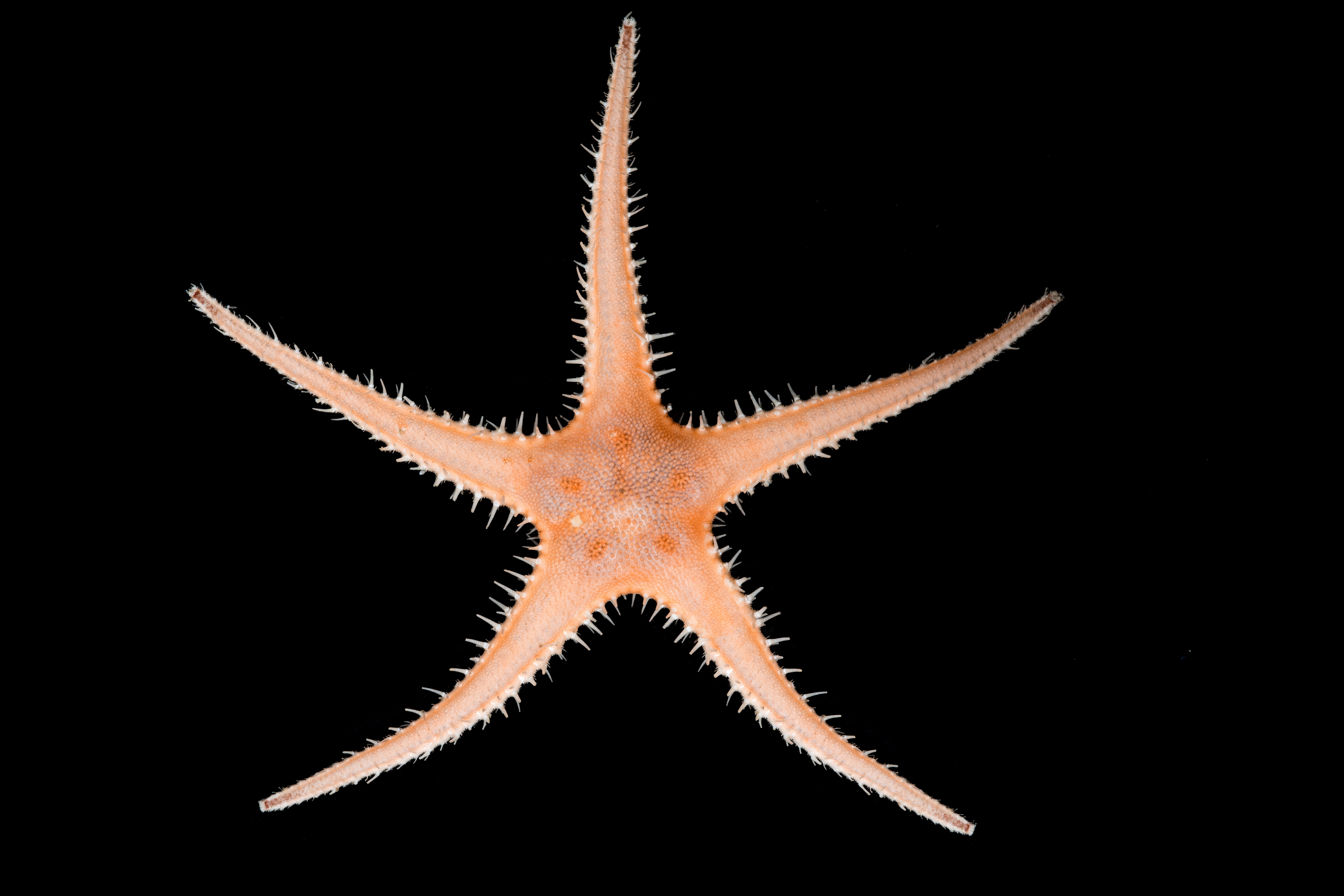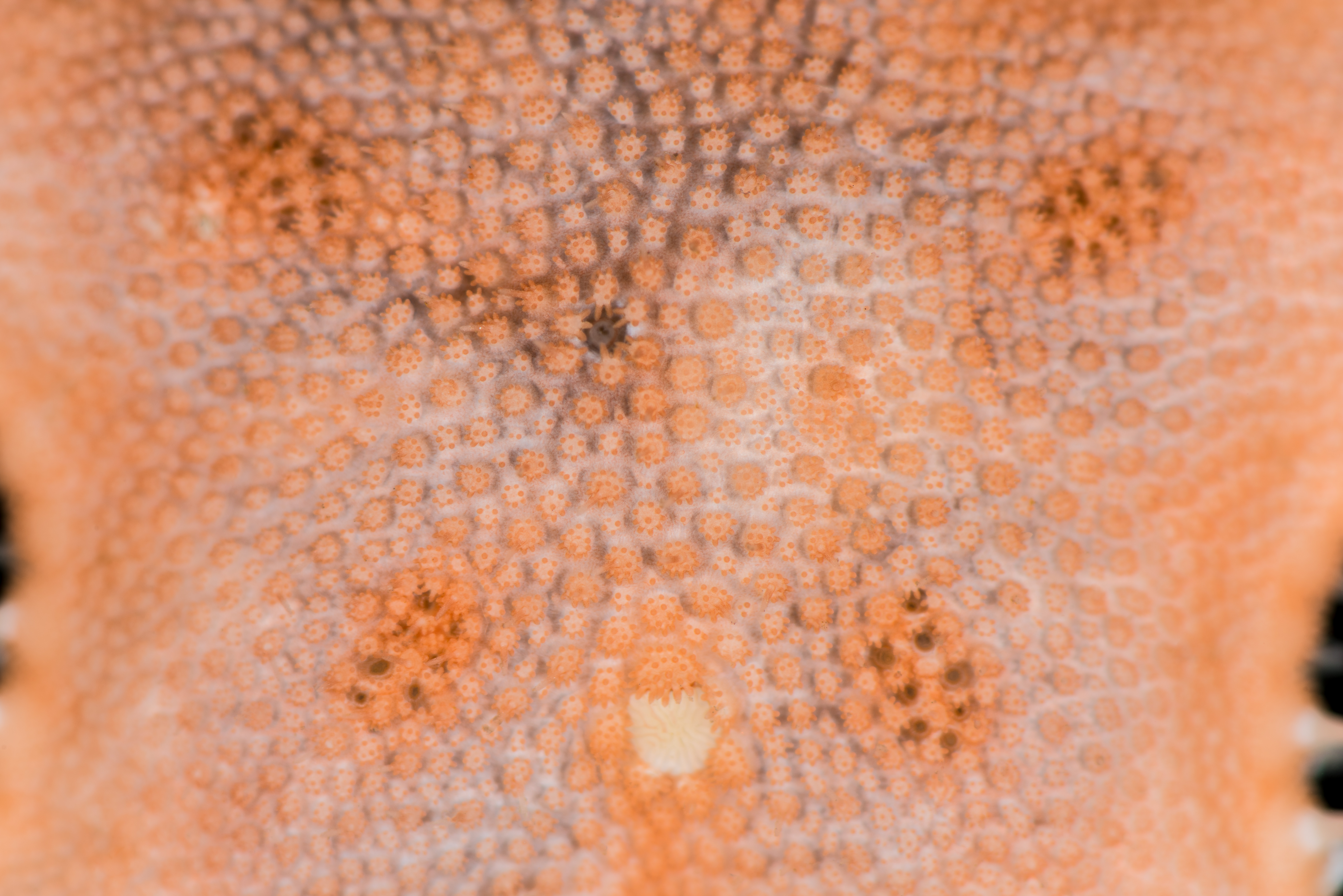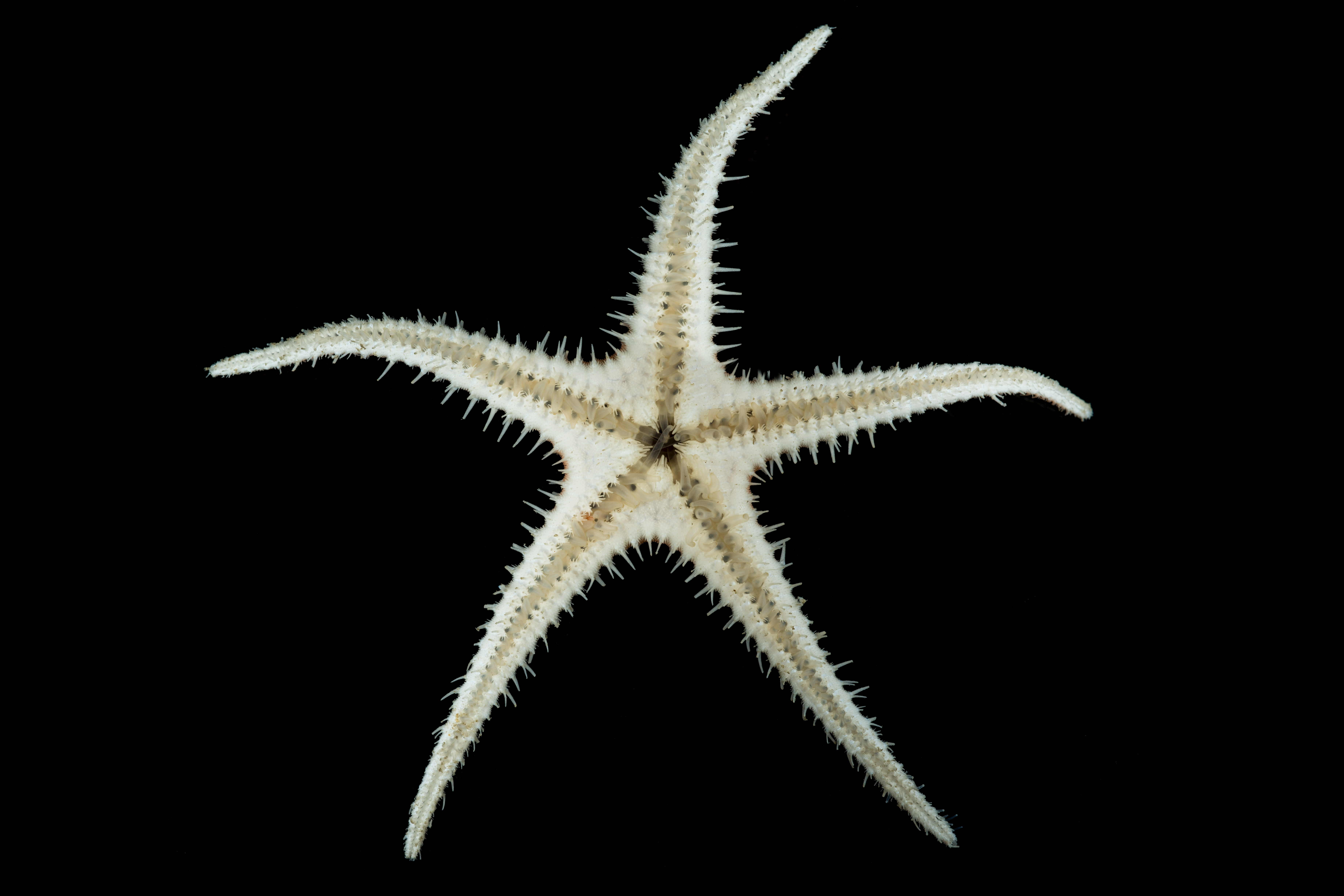 Fem armer med lange pigger langs siden, på både øvre- og nedre marginalplate. Den er også rimelig flat, og har fem ganske synlige, karakteristiske ovale områder med små blærer (papulae) på midtskiven. Blærenes avgrensede plassering er karakteristisk for hele denne ordenen.
