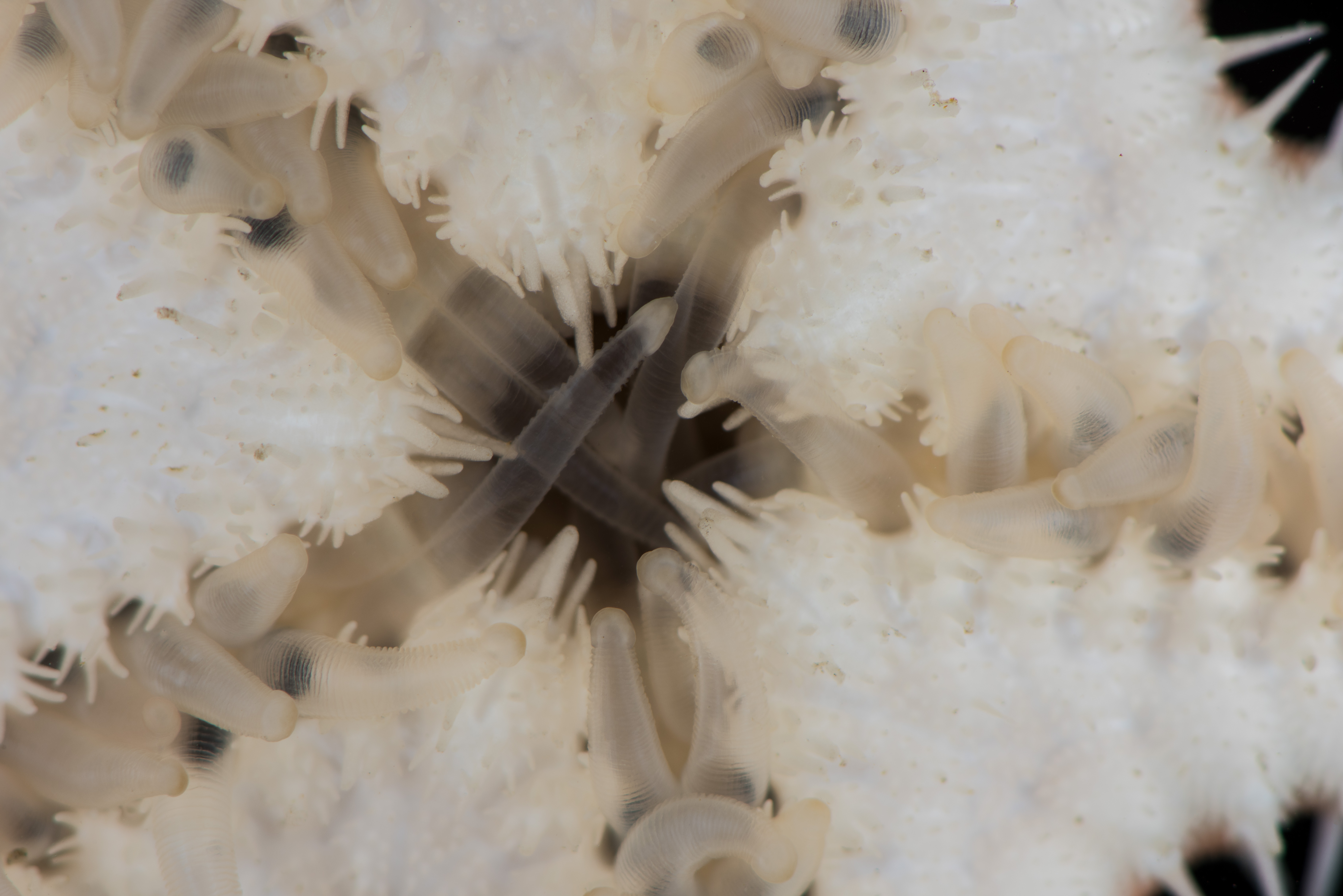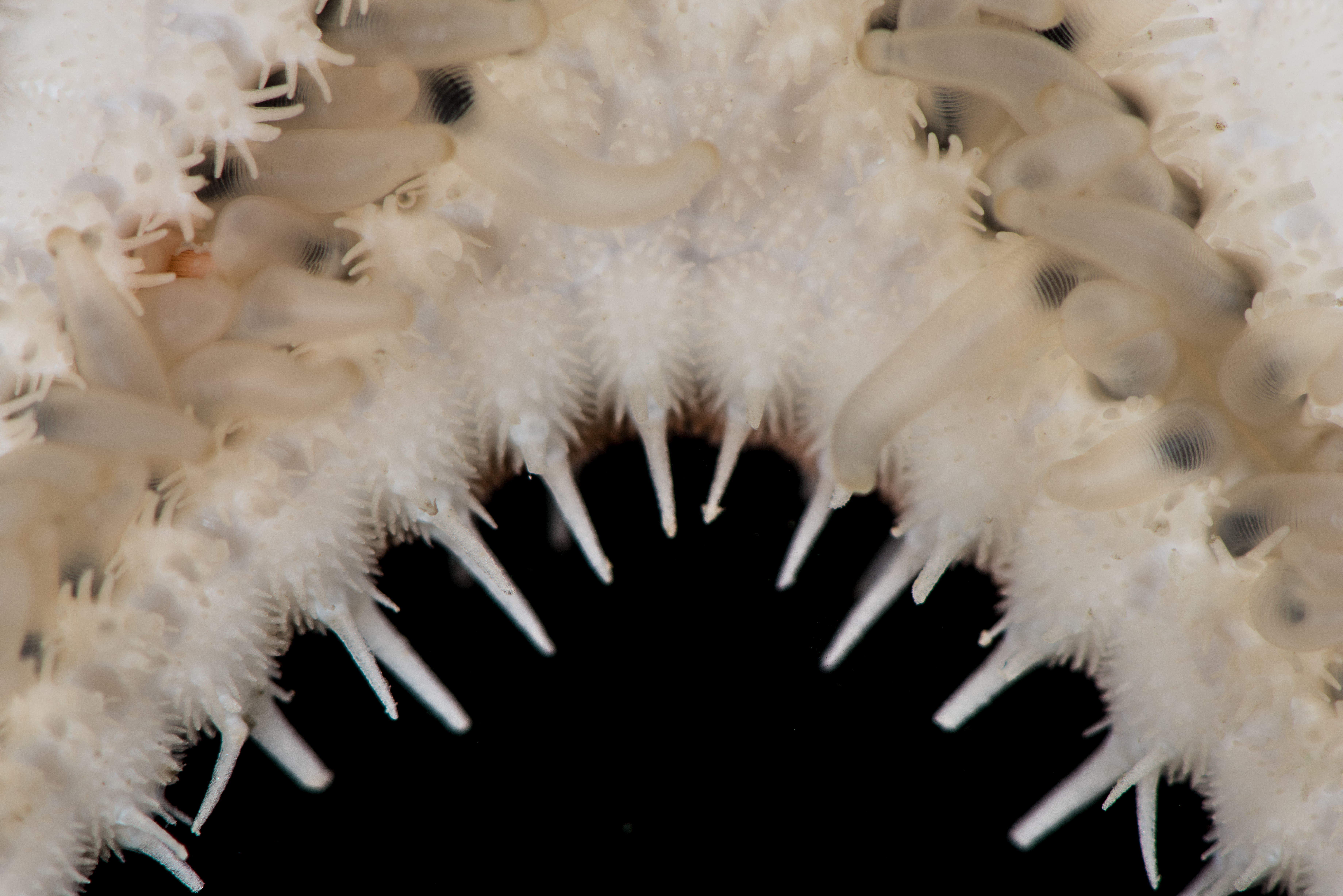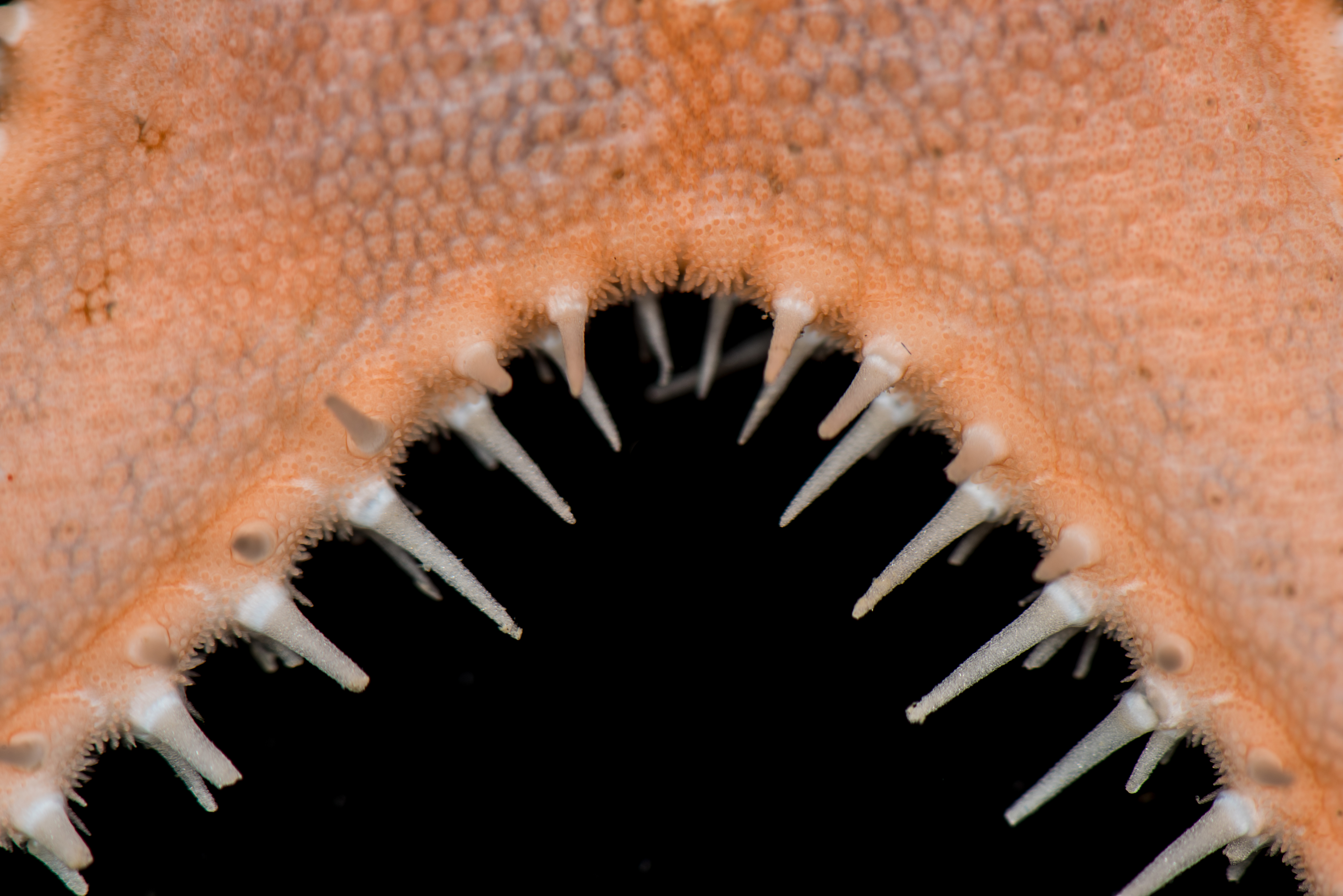 Fem armer med lange pigger langs siden, på både øvre- og nedre marginalplate. Den er også rimelig flat, og har fem ganske synlige, karakteristiske ovale områder med små blærer (papulae) på midtskiven. Blærenes avgrensede plassering er karakteristisk for hele denne ordenen.