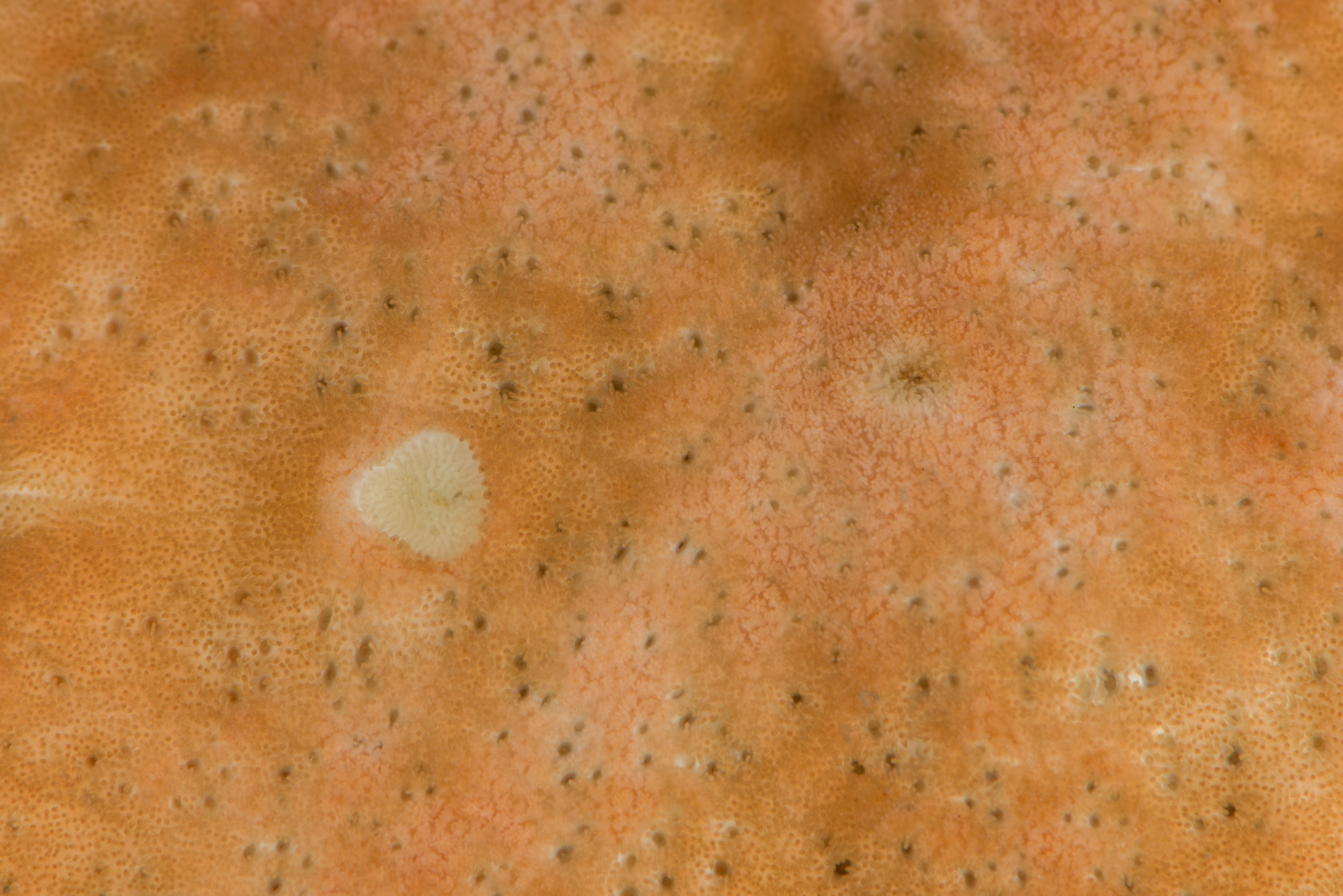 En ganske flat art som er rødoransje på oversiden, og hvitaktig på undersiden. Oversiden dekket med små, avlange pigger. 10-15 gassblærer per område. Marginalplatene formet som blokker, og har små pigger. 2 furepigger.