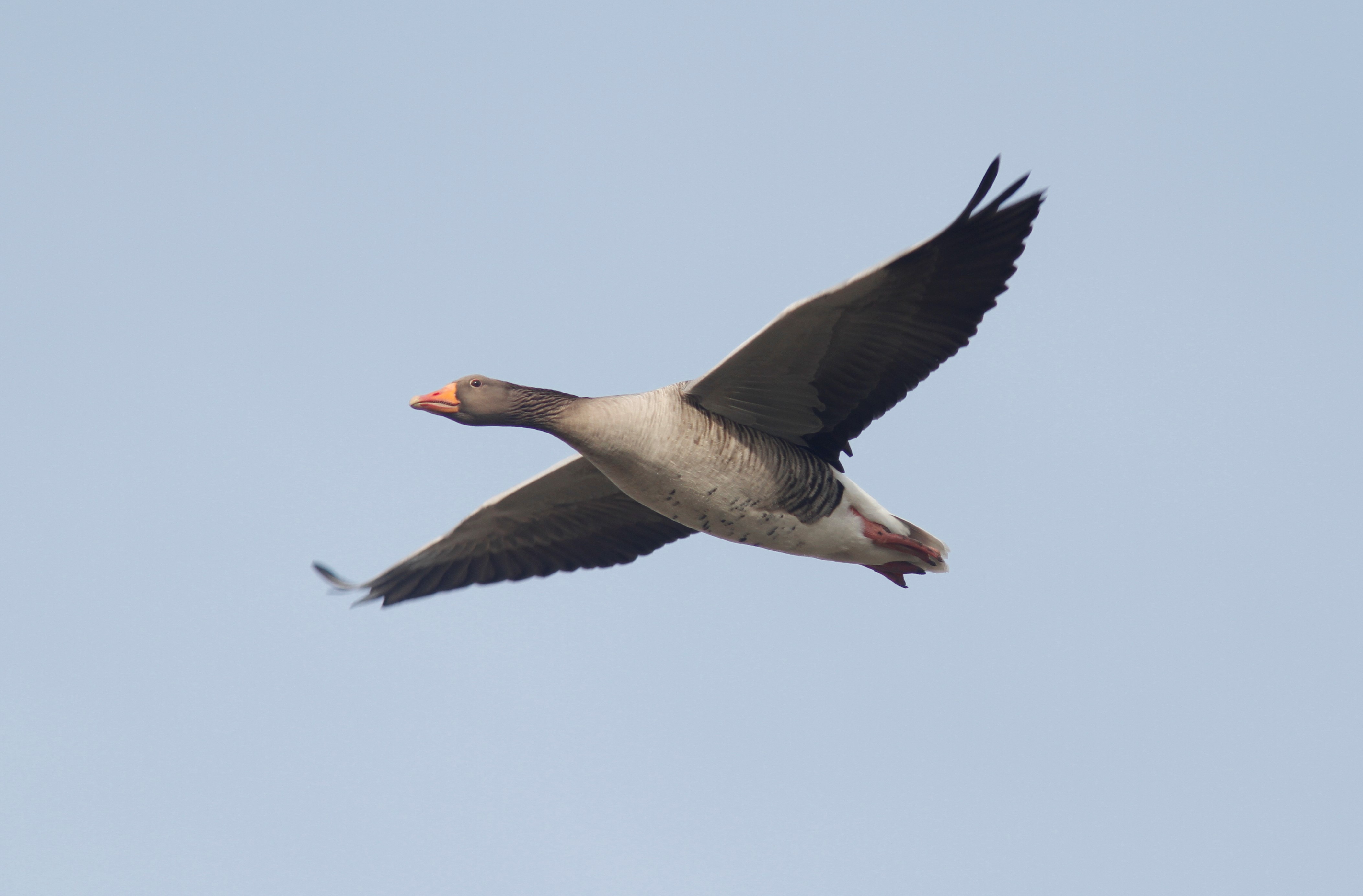 I flukt er grågåsa lett kjennelig fra de andre gåseartene på en lys framvinge.
