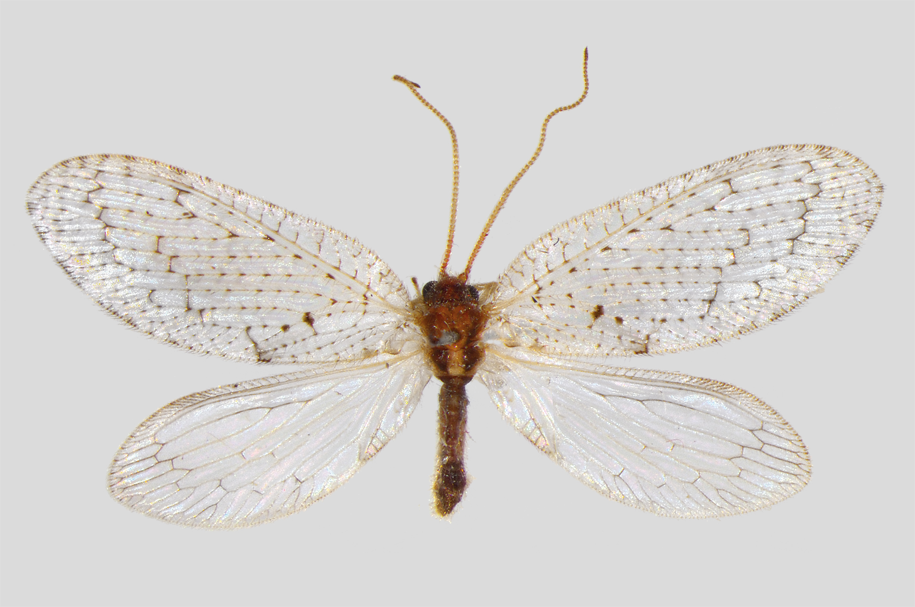 Hode og forkropp er gulbrune med bred, blekgul midtstripe, bakkroppen er lys med mørke flekker på oversiden. Forvingene er klare med et svakt gulaktig skjær, og langs bakkanten er det alternerende lyse og mørke partier. Ribbene har svake og ikke særlig påfallende skygger og flekker. Den innerste tverribben mellom subcosta og radius er helt eller delvis lys, og radius har normalt tre sidegrener. Det er en karakteristisk, strekformet flekk mellom cubitalribbe 1 og cubitalribbe 2 (men denne kan være utydelig). Bakvingene er klare, av og til med enkelte mørke tegninger eller skygger. Forvingelengde 6–10 mm.