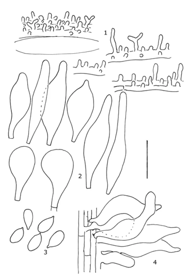 1. Hatthudshyfer, 2. Cheilocystidier, 3. Sporer, 4. Caulocystidier.