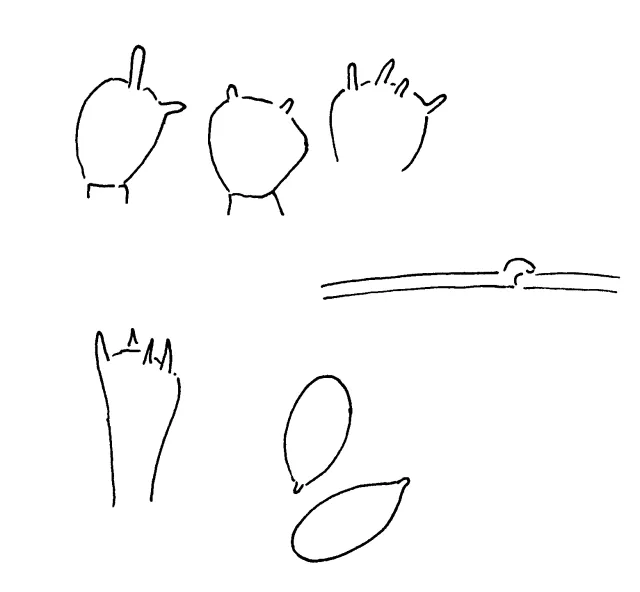 Cheilocystidier, basidium, hatthudshyfe og sporer.