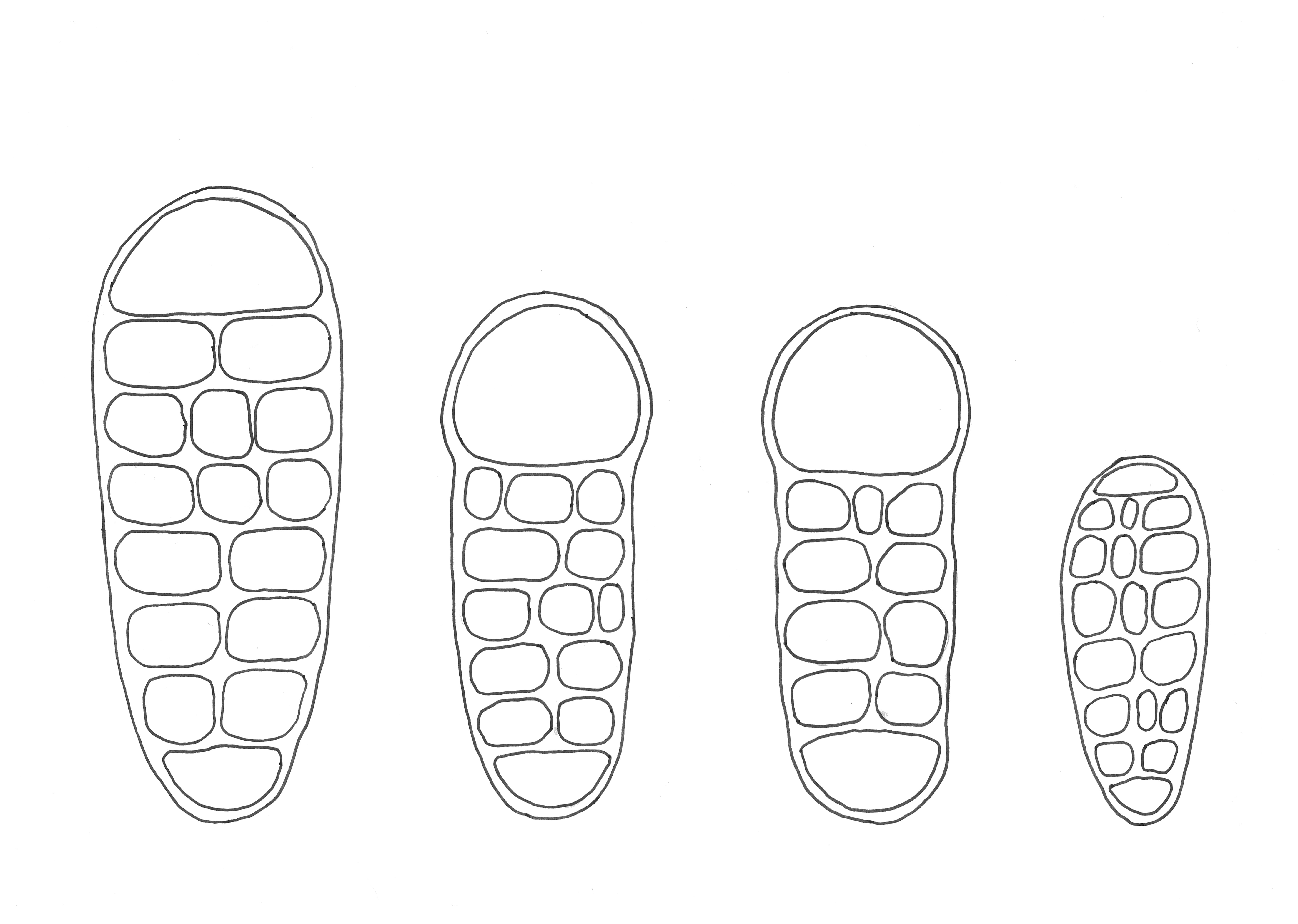 Figur 1. Sporetegninger, fra venstre mot høyre: Trønderflekklav Arthothelium norvegicum, nettsporeflekklav Arthothelium dictyosorum, hasselflekklav Arthothelium macounii og jaguarflekklav Arthothelium ruanum. Sporen til nettsporeflekklav er 30 µm lang.