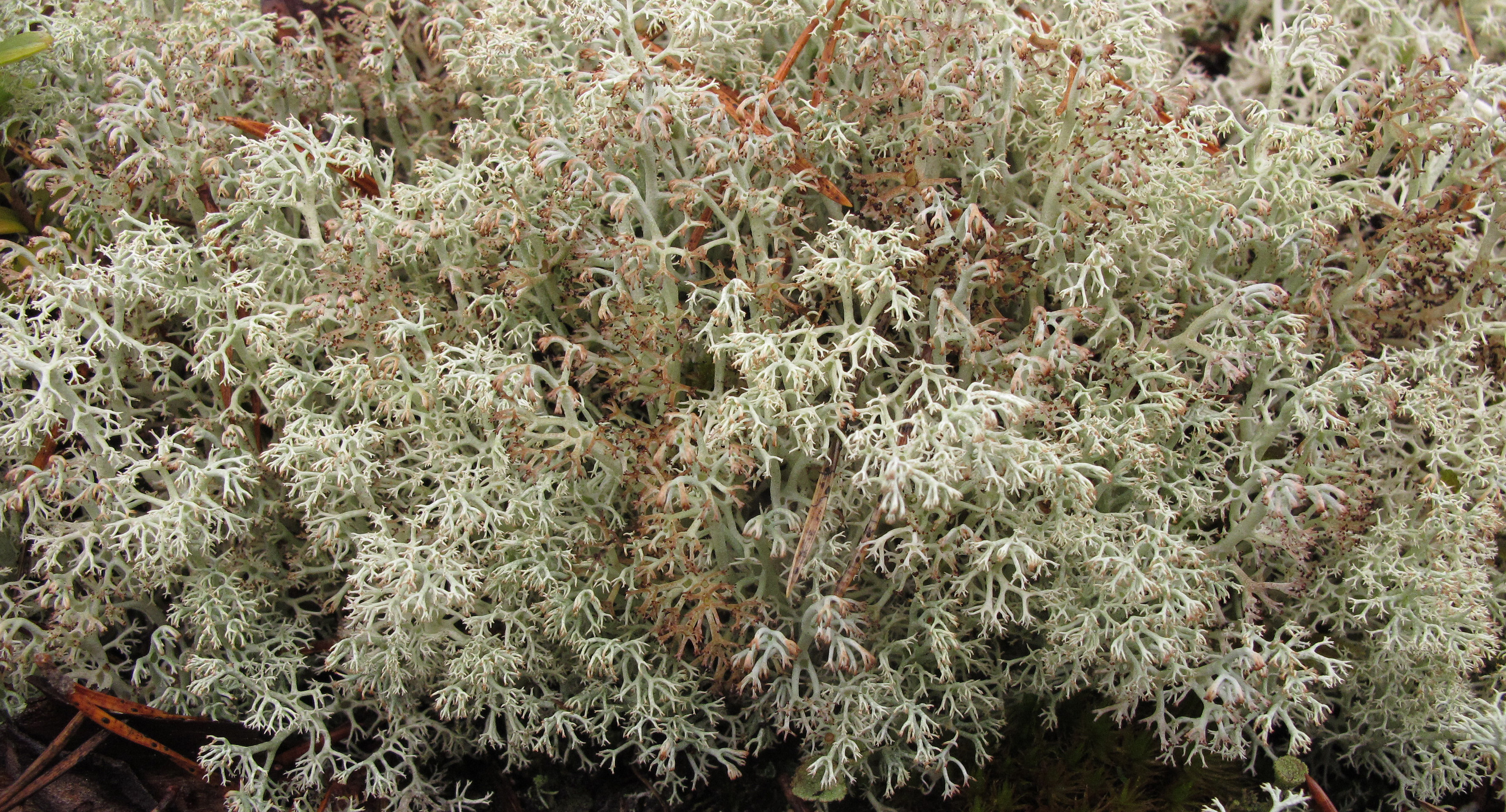 Lys reinlav med et par podetier av grå reinlav innblandet. Merk fargeforskjellen.