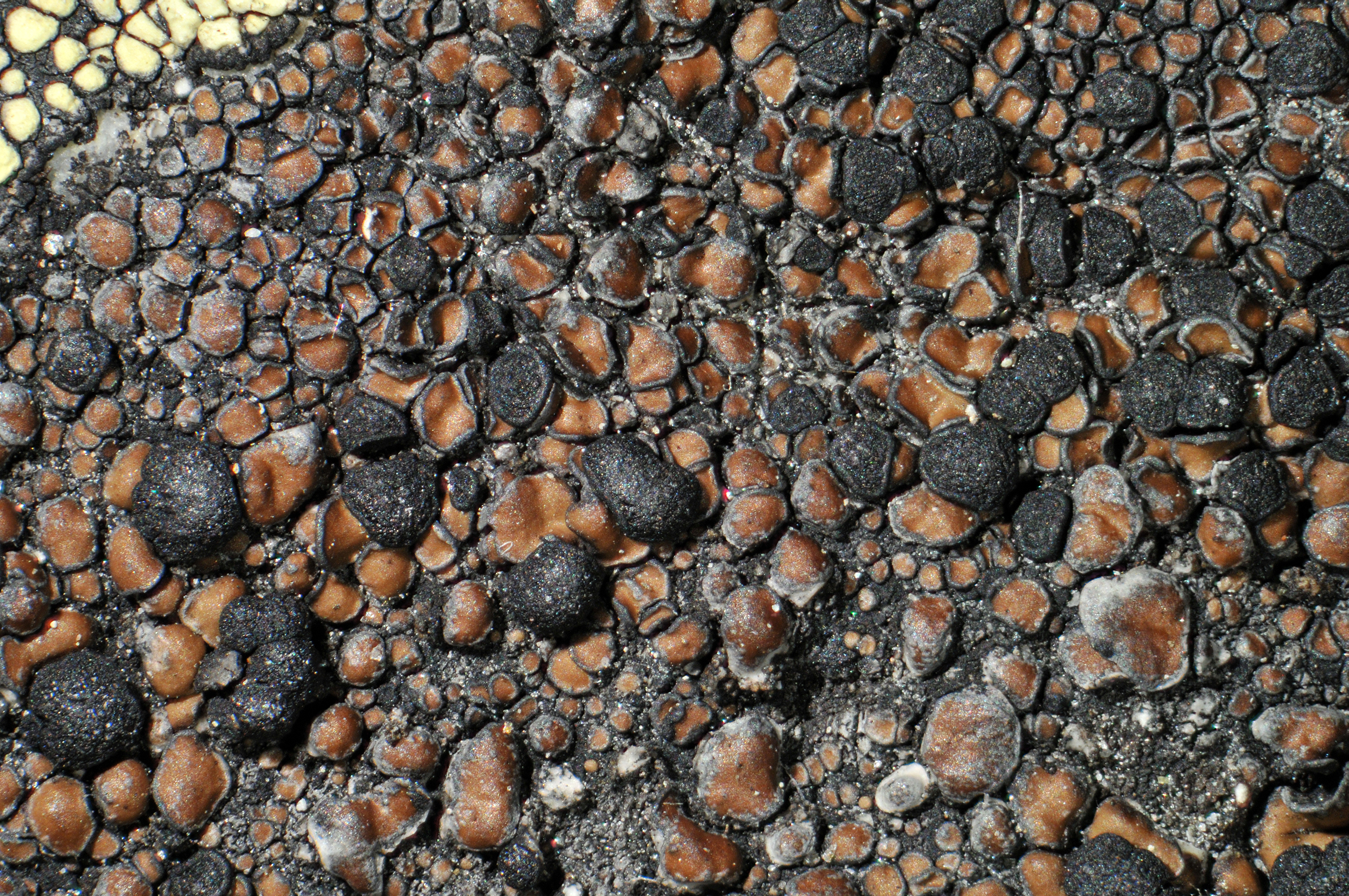 Thallus er areolert og blir opp til 10 cm i diameter. Hypothallus er godt utviklet og det er svart. Areolene blir opp til 1 mm i diameter, mellombrune, glinsende og med en mellomgrå til gråsvart kant. Areolene er spredtstilte til sammenstilte, mer eller mindre runde, flate til dypt konkave og skjoldformete. Margen reagerer ikke med KI (KI–).