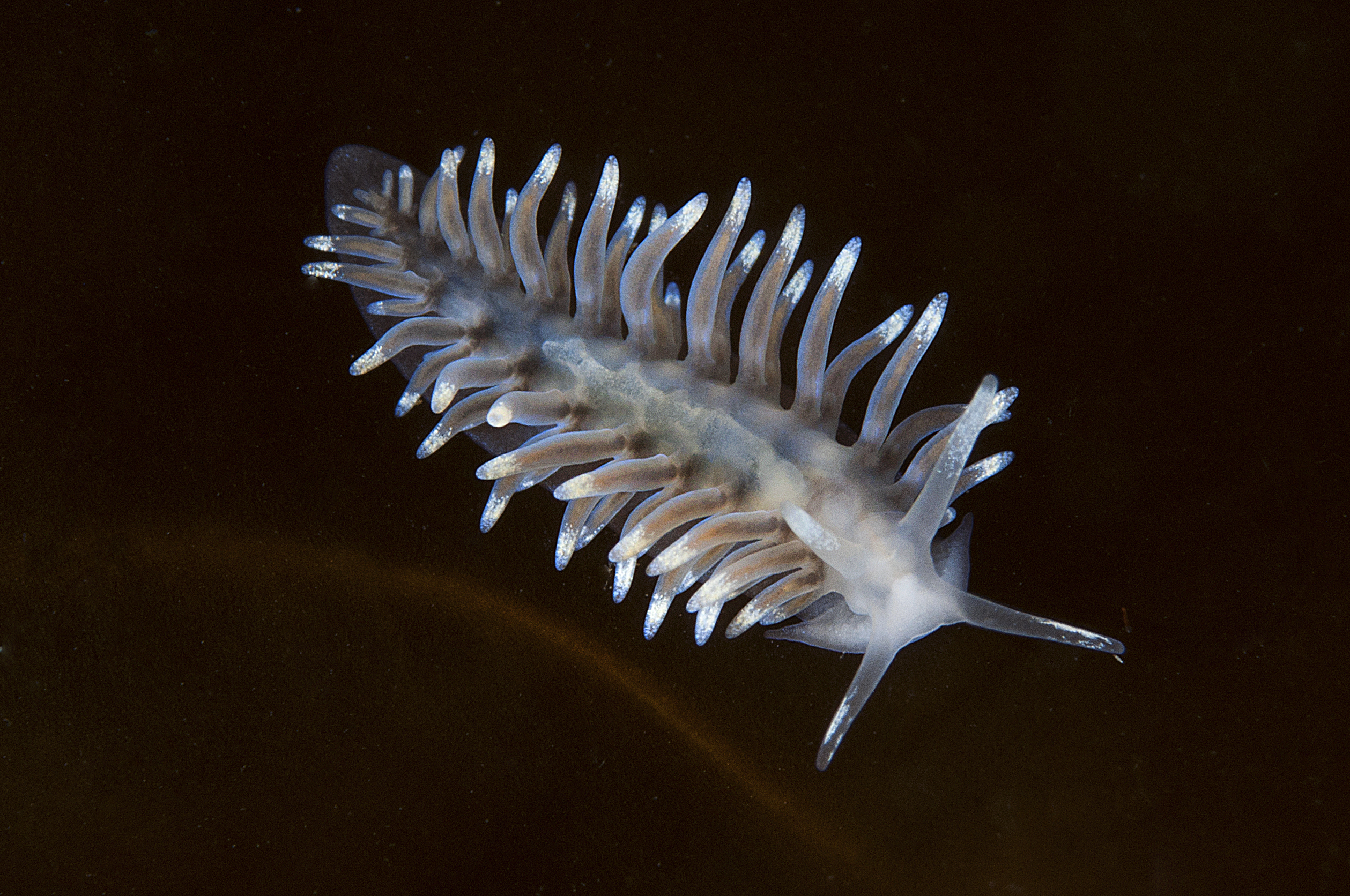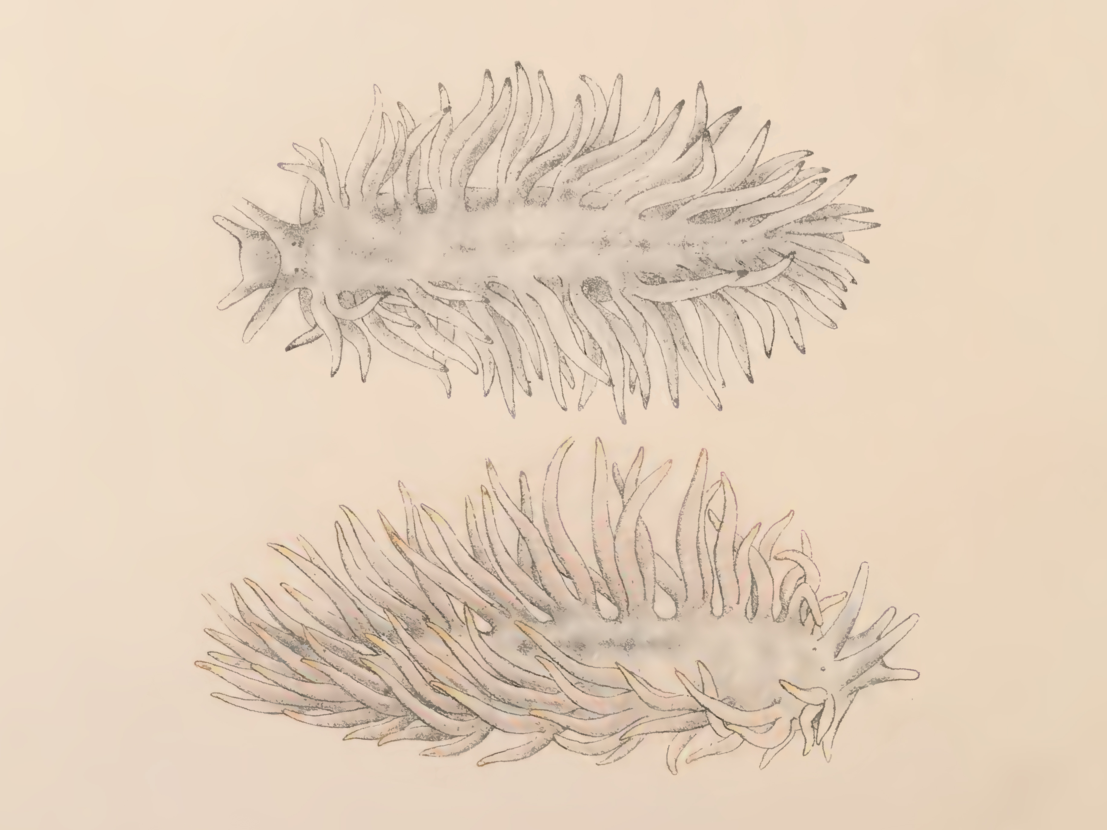 Kroppsfargen er gjennomsiktig slik at de indre organene synes tydelig. Det er tarmkanalene som gir dyret farge, og to ulike fargemønstre er beskrevet. Det første fargemønsteret er individer med gulbrune tarmkanaler. De har en kremgul ytre pigmentering som dekker tuppene på cerata. Det andre fargemønsteret er individer med blågrå tarmkanaler. Disse har også en kremgul ytre pigmentering som dekker tuppene på cerata. Munntentaklene og rinoforene hos begge typene kan være dekket av nesten helt hvite til kremgule tupper.