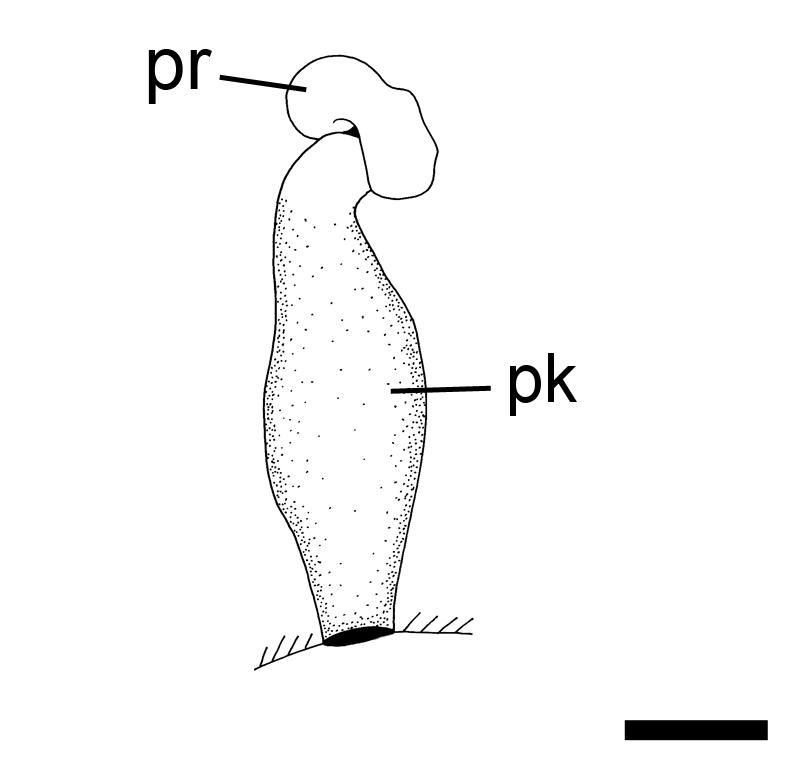 Det hannlige reproduksjonssystemet, målestokk =  250 μm. Forkortelser: pk: peniskammer, pr: prostata.