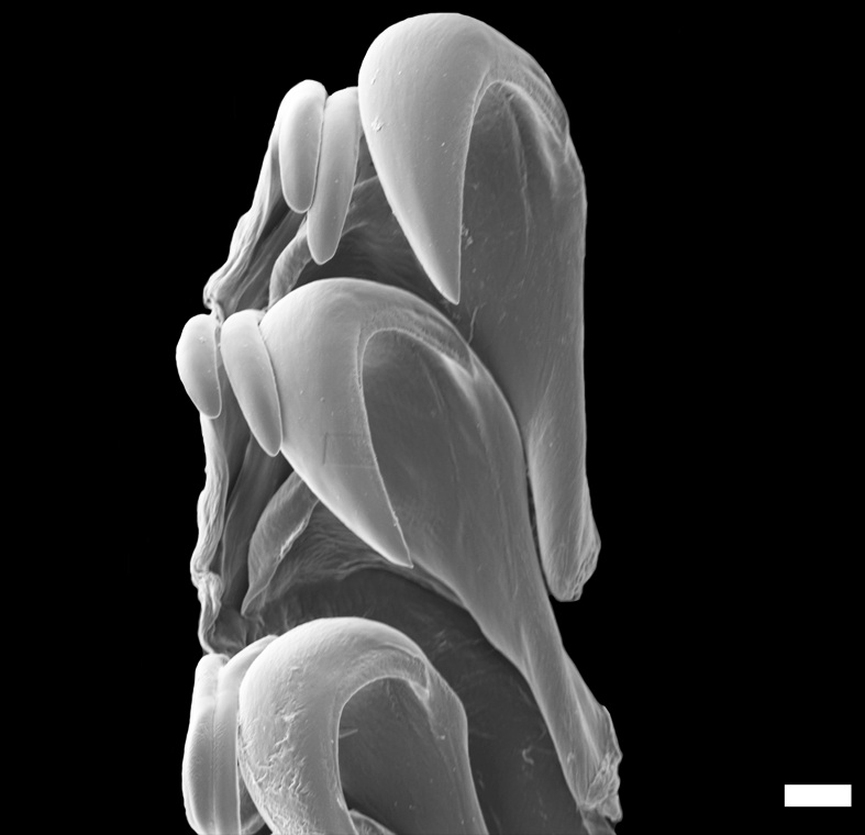 Detalj av radula (SEM), målestokk = 20 µm.