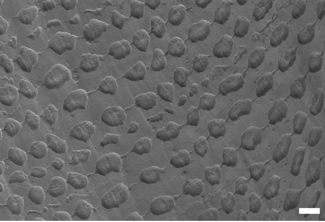 Skulpturen på skallets overflate (SEM), målestokk = 50 µm.