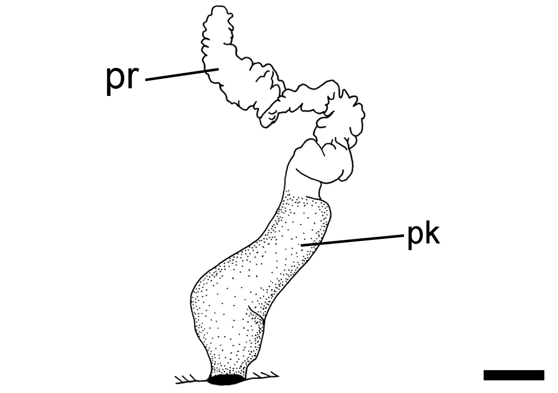 Det hannlige reproduksjonssystemet, målestokk = 50 μm. Forkortelser: pk: peniskammer, pr: prostata.