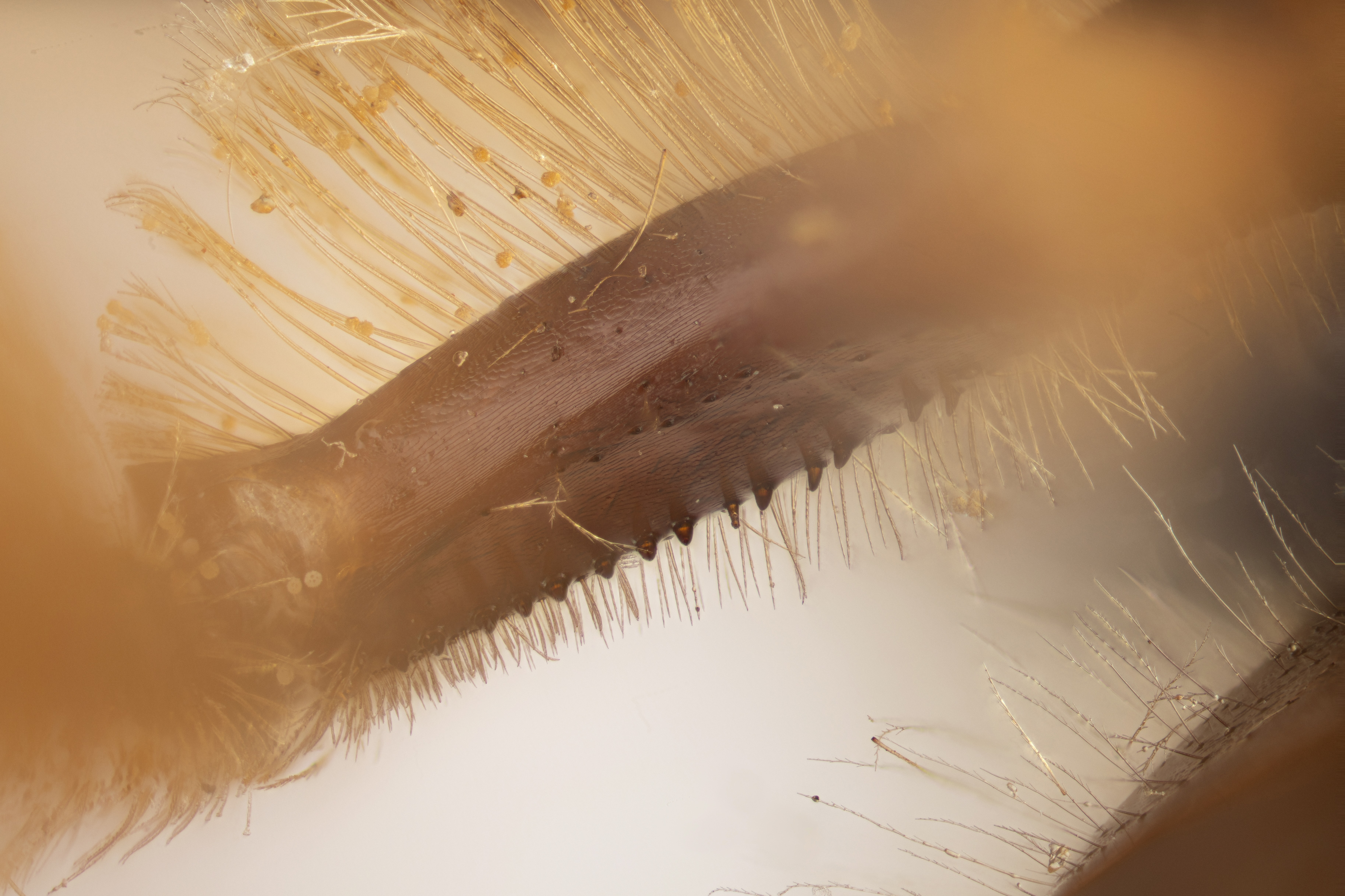 Hunnen av slåttesandbie har en karakteristisk sagtakking på undersiden av baklårene.