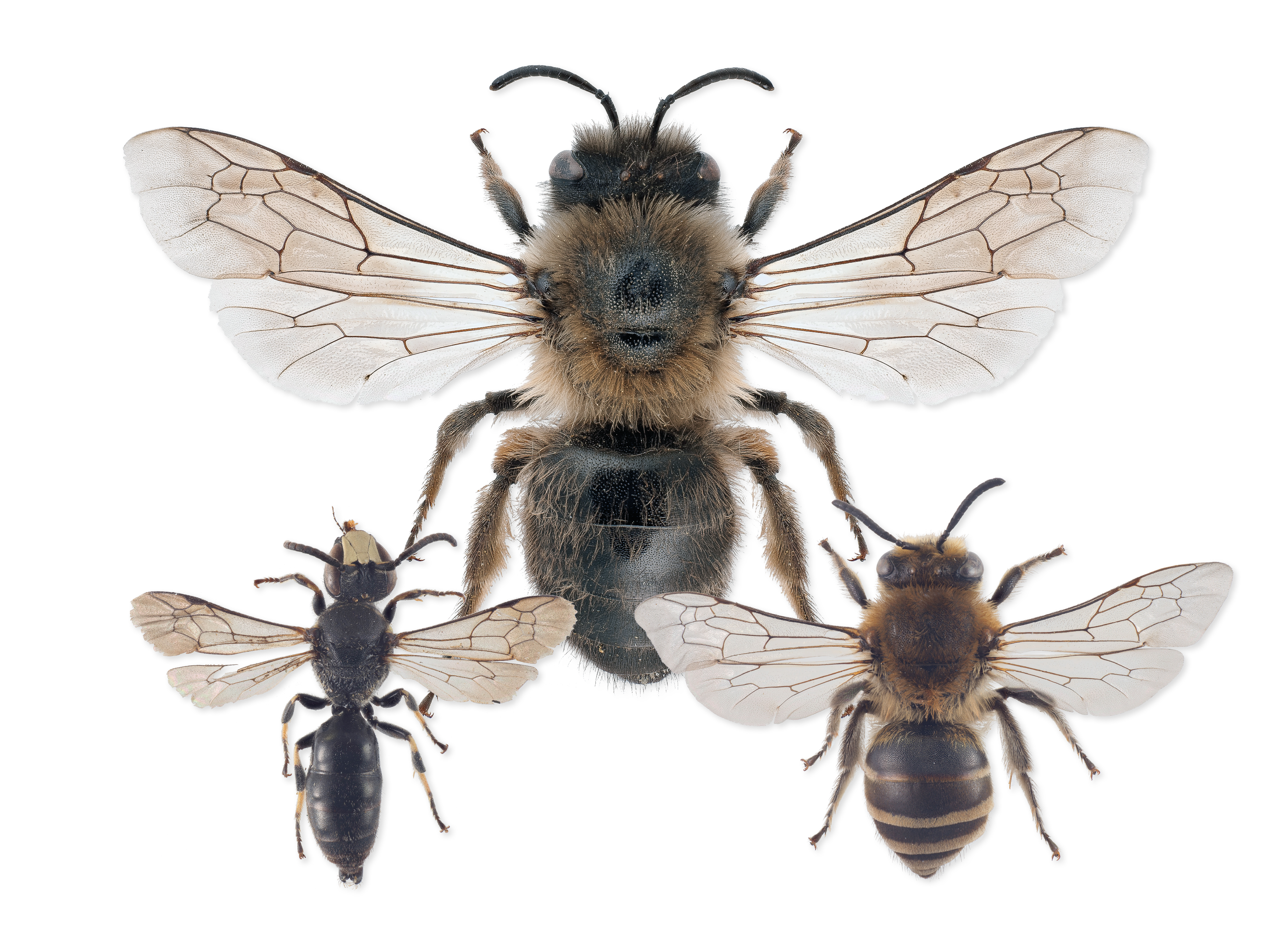 Korttungebiene varierer mye i utseende. Øverst: vårsilkebie Colletes cunicularius. Til venstre: heimaskebie Hylaeus incongruus. Til høyre: lyngsilkebie Colletes succinctus. Størrelsesforholdet er ikke riktig på bildet.