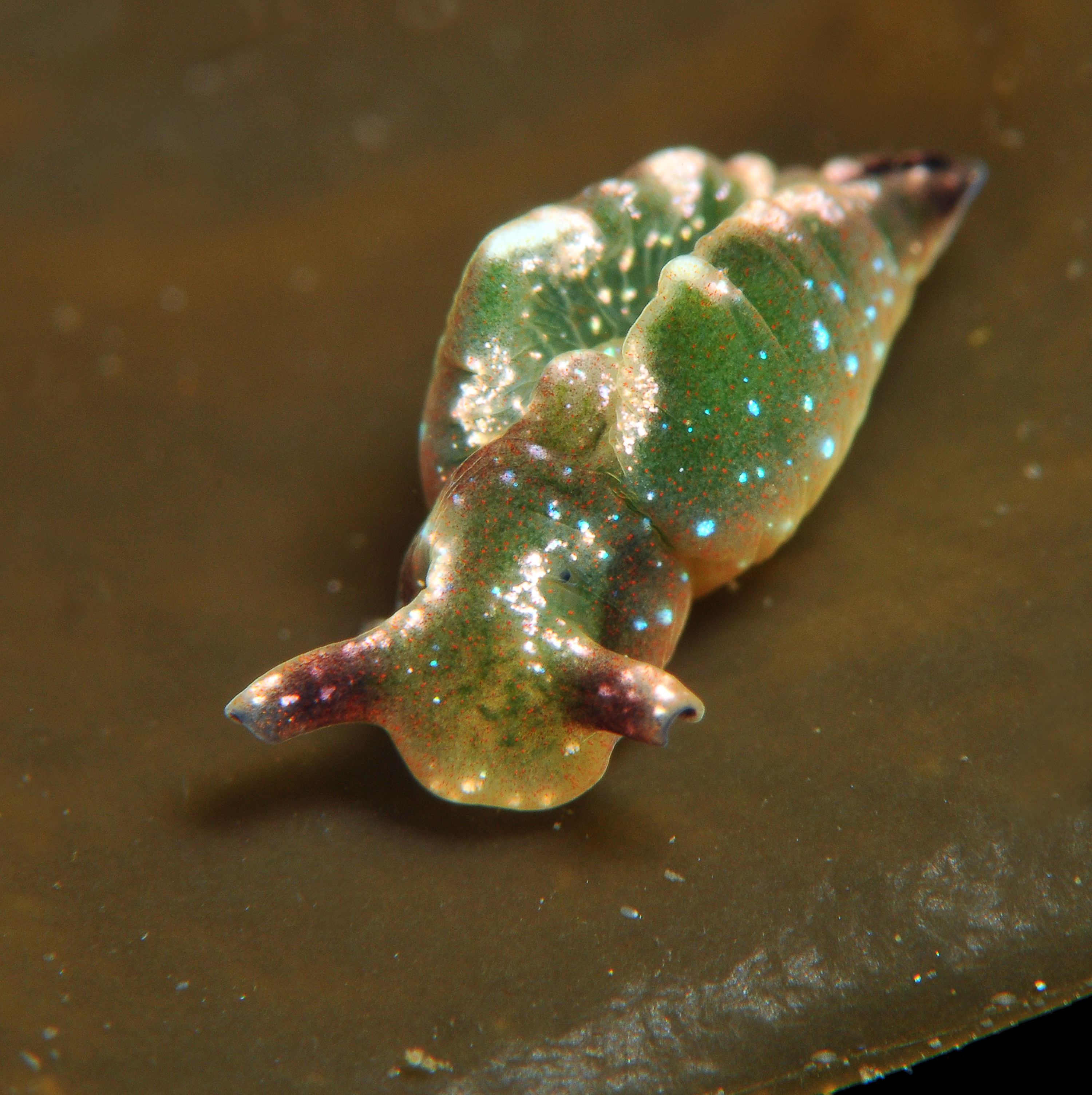 Elysia viridis blir opptil 45mm lang, og finnes bare på grunt vann.