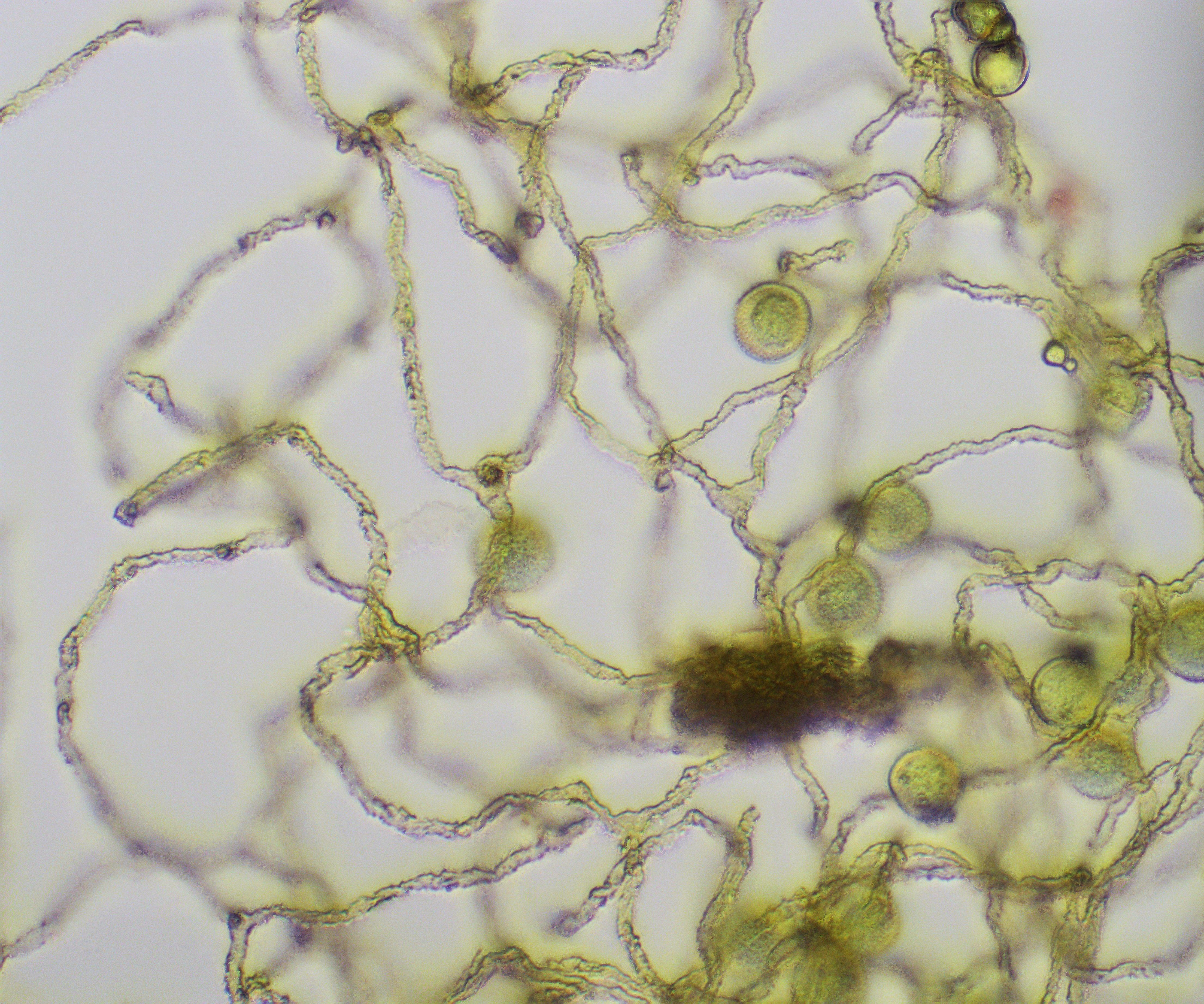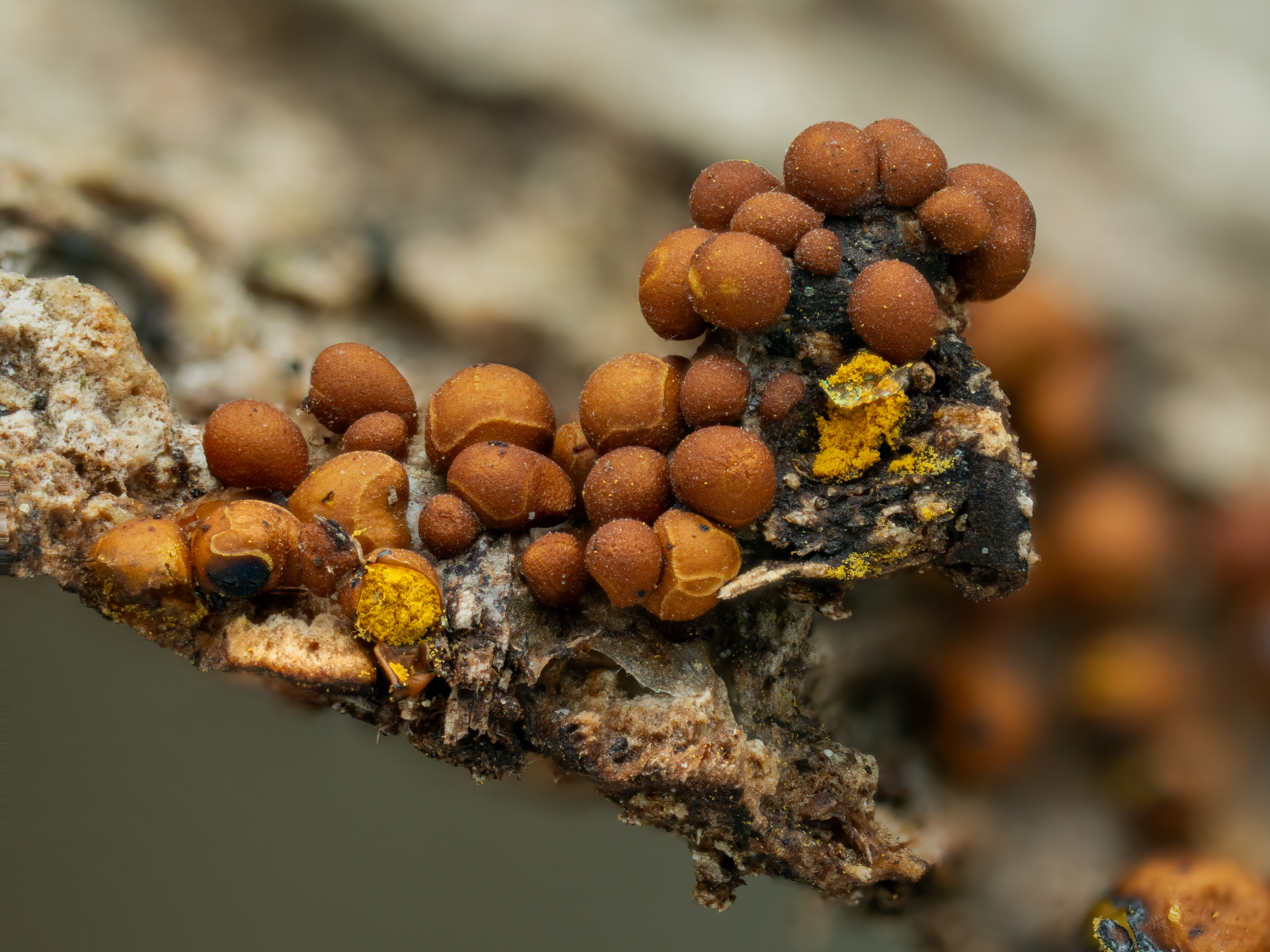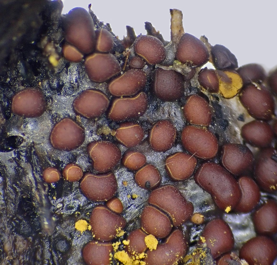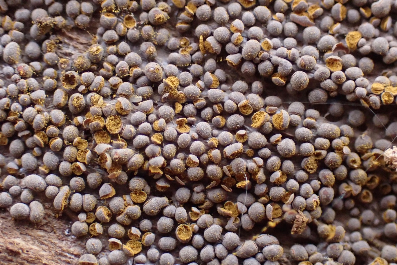 Arten har nærmest kuleformede, puteformede sporokarper, ofte blandet med korte plasmodiokarper, oftest i tette samlinger. Peridiet er matt, rødbrunt eller gulbrunt, ugjennomskinnelig, og kan ha hvite krystallavleiringer i øvre del. Det består av to tett sammenvevde lag (vanskelig å se). Kapillitietrådene består av et nettverk av nesten fargeløse, enkle eller forgrenede tråder. Disse er 1,5–4 µm tykke og kan være nesten glatte, men som oftest har de korte pigger og uregelmessige innsnevringer. Noen ganger mangler kapillitiet nesten helt. De lysegule sporene er tett besatt med ørsmå pigger eller vorter og måler 11–14 µm.