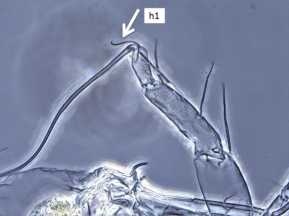 Rensebeinet hos nøttemuslingkreps. Legg merke til det langstrakte ytterste leddet, som er dobbelt så langt som det er bredt, som kjennetegner slekten Cyclocypris. Det S-formete ytterste håret (h1) gjør det lett å identifisere nøttemuslingkreps.
