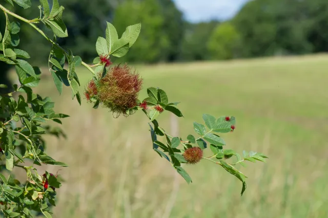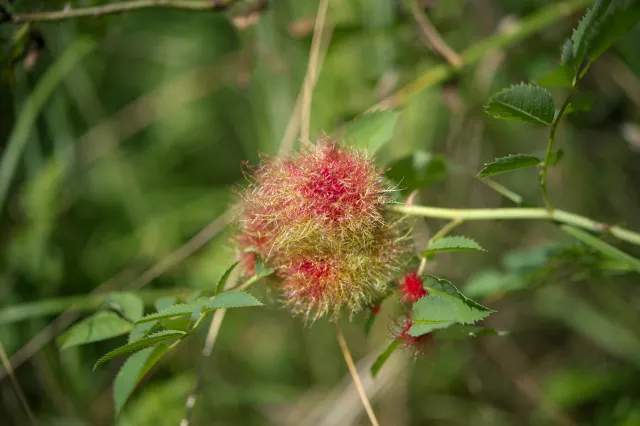 Gallen er stor og synes godt på vertsplanten. Fargen er rød og grønn. Størrelsen varierer, men den kan bli stor som en tennisball, med torner og "hår". Man ser ofte de forvedete gallene sitte igjen på greina når bladene har falt av nypebuskene om høsten.