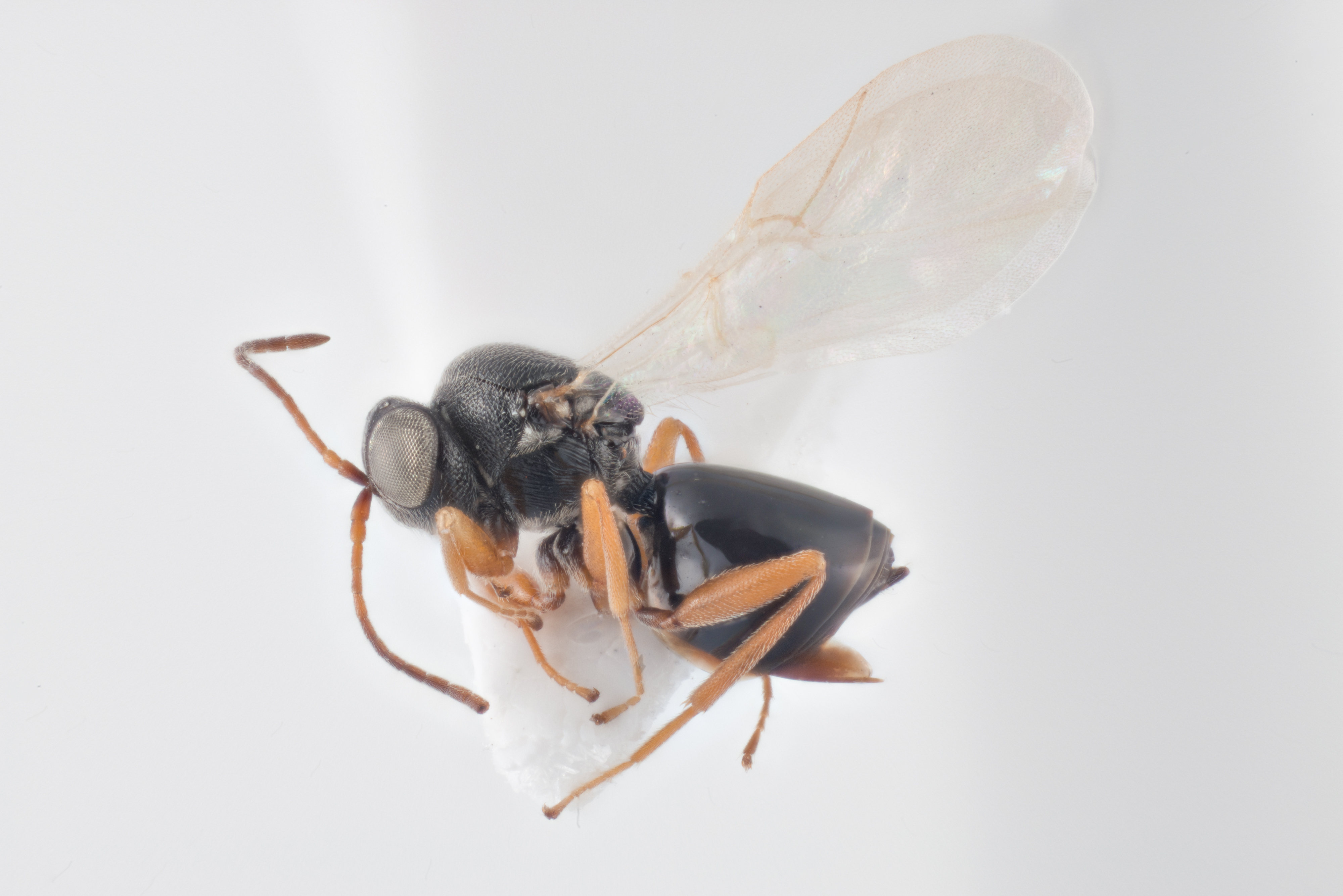 Hunn: Antennene er gule og med 13 antenneledd. Første antenneledd (scapus) er mørkebrunt, andreleddet (pedicellus) er langt som et normalt ledd, mens tredjeleddet er kort. Hodet er svart til mørkebrunt farget. Munndelene er gule. Mellomkroppen er noe hårete med mikrostruktur. Ryggsiden har halv lengde på notauliene og ingen midtfure imellom. Vingeskjellene (tegulae) er brune. Skutellgropene er adskilte. Mesopleuron har langsgående struktur. Beina er gule med mørkere hofter. Vingene har lysegule ribber og jevn behåring, med en åpen radialcelle. Bakkroppen er mørk og skinnende med ett "hovedsegment" uten punktuering. Lengde 1,3–1,6 mm.