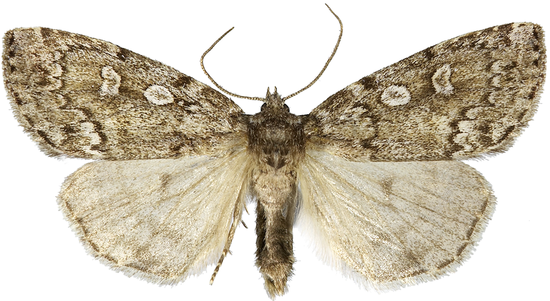 Svært lik @(spinkelt taigafly). Ved å pensle bort skjell og hår på hannens bakkroppsspiss, vil de ytre deler av kjønnsorganene blottlegges. Hos @(kryptisk taigafly) har valven to utspring av nesten samme størrelse. Hos @(spinkelt taigafly) er det nedre utspringet tydelig mindre enn det øvre.