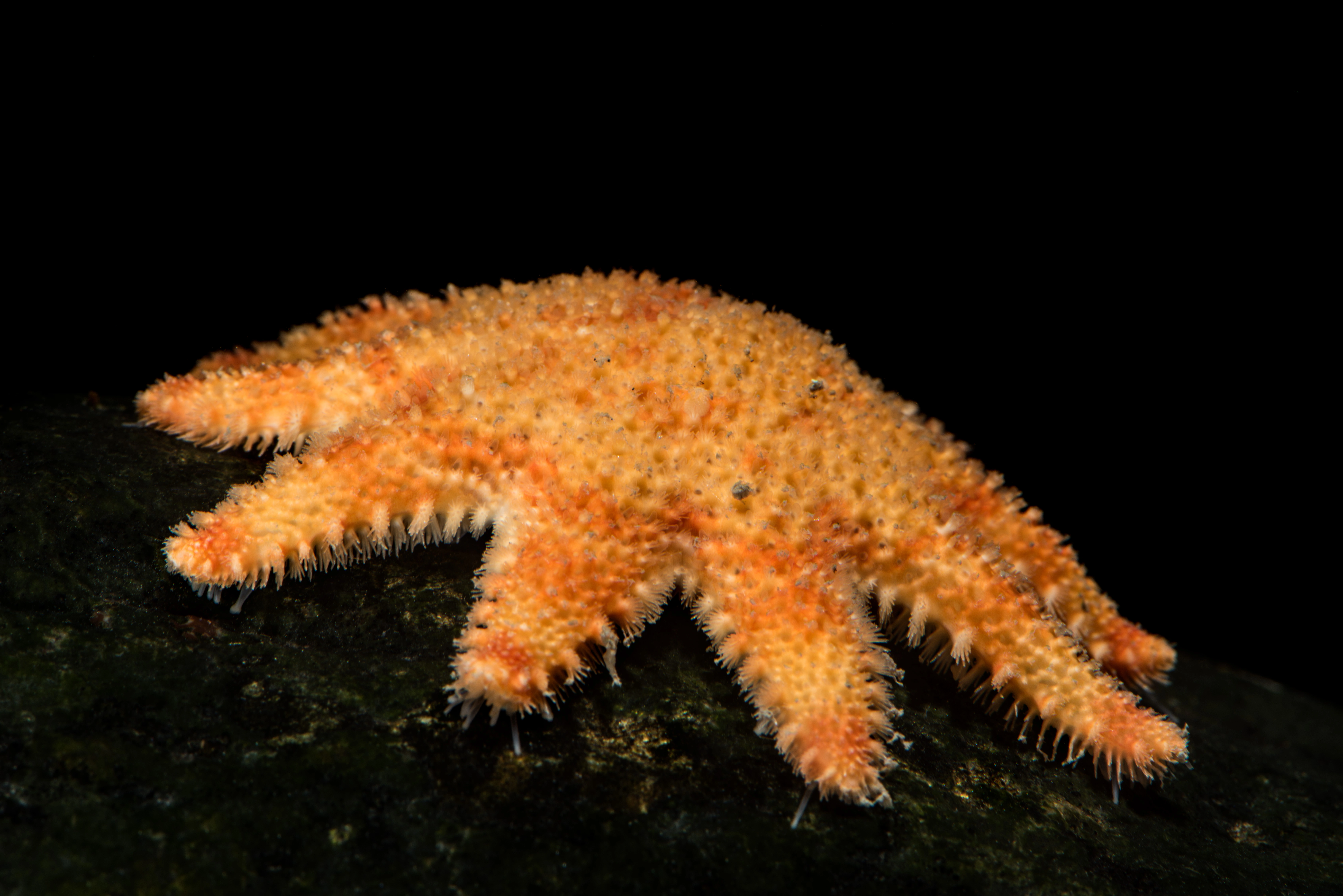 Oransjerød art med 9-11 armer. Hele kroppen er dekket av klaser (paxiller) med lange pigger som synes godt, og paxillene sitter på kalkplater som overlapper hverandre noe. 5-7 furepigger.