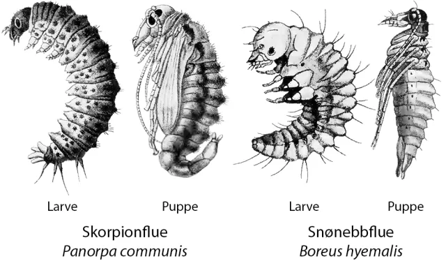 Skorpionfluene (Panorpidae) er middelsstore insekter med to par brunflekkete vinger. De finnes gjerne i fuktig eng- og krattvegetasjon hvor de i hovedsak livnærer seg av døde insekter. Hannen har et karakteristisk stort kjønnsorgan som minner om en skorpionhale. Snønebbfluene (Boreidae) er små insekter med reduserte vinger som lever på snøen om vinteren. Begge familiene kan kjennes på det snuteaktig forlengede hodet med bitende munndeler.