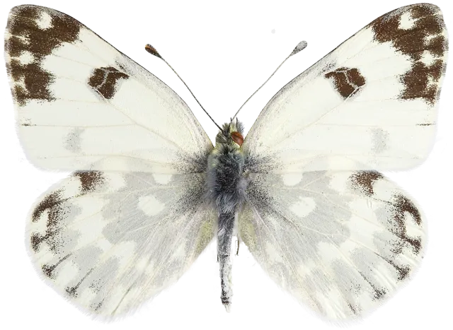 Begge vingepar er hvite med svarte tegninger: En stor flekk midt på framvingen, runde flekker langs øvre del av ytterkanten og innenfor disse ytterligere en rad mørke flekker. Hunnen har ytterligere en flekk på framvingen under den store midtflekken, og har dessuten mørke tegninger på bakvingen. Hannen har kun ubetydelige svarte tegninger på bakvingens overside, men begge kjønn har et brokete grønt mønster på undersiden av bakvingen som på oversiden skinner igjennom som grå tegninger .