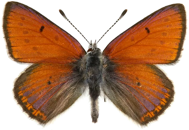 Hannens vingeoverside er skinnende mørkerød med fiolett skjær. Framvingen har mørk midtplett, samtidig som en plettrad ofte er antydet nær ytterkanten. Nedre halvdel av bakvingen er brunsvart med fiolett skjær. Hos hunnen mangler framvingen det fiolette skjæret, samtidig som den har rader med mørke pletter og enkeltpletter. Disse kan være strekformet forlenget og flyte sammen. Hos enkelte individer er framvingen nesten rent brunsvart. Bakvingeoversiden er brunsvart med unntak av et framtredende oransje bånd langs ytterkanten, som kan være kantet med blå pletter innad. Framvingeundersiden hos begge kjønn er grå til oransje med svarte pletter. Bakvingeundersiden er grålig med svarte pletter og et oransje bånd nær ytterkanten.