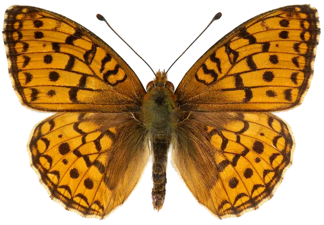 En av våre fire største @(perlemorvinger). Vingeoversiden er oransje med svarte flekker og fine svarte ribber. Hos hannen er framvingens ribbe 2+3 bakfra svakt fortykkede med duftskjell. Bakvingeundersiden er gul med grønne og brune sjatteringer og har flere store pletter som vanligvis er gule, sjeldnere sølvfargede. Langs kanten er det en rad rustrøde øyeflekker, et trekk som skiller arten fra @(aglajaperlemorvinge). Arten er svært lik @(adippeperlemorvinge), og det eneste sikre skilletegnet er hannens duftskjellribber som hos @(niobeperlemorvinge) ikke er nevneverdig fortykkede. Ellers kan arten skilles fra @(adippeperlemorvinge) på en kombinasjon av følgende karakterer: vingespenn gjennomsnittlig mindre, 41–52 mm. Forvingens ytterkant rett eller svakt konveks. Bakvingens underside vanligvis med gule, sjeldnere med sølvfargede flekker. Disse er ofte kantet med skarpe svarte streker. Den midterste av de brunkantede øyeflekkene vanligvis tilstede. Indre del av bakvingen i gule, grønne og/eller brune sjatteringer med relativt skarpe overganger mellom fargene.