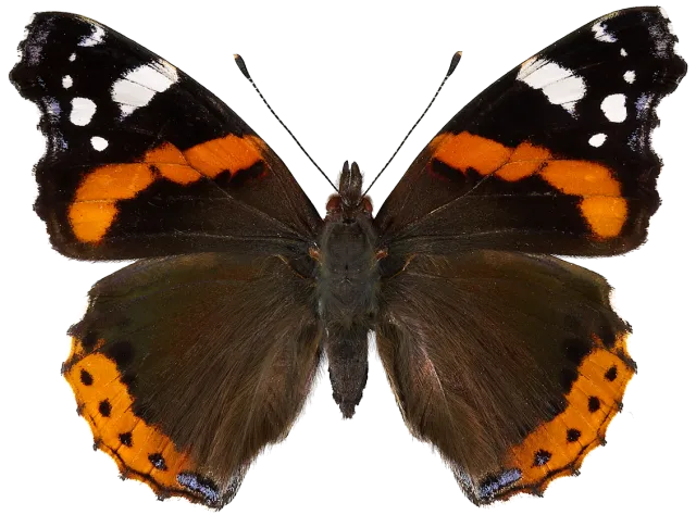 Vingeoversiden er fløyelssvart. Framvingen har et rødt skråbånd, og utenfor dette flere hvite flekker. Bakvingen har et rødt kantbånd med fire separate svarte flekker og med blå tegninger bakerst. Arten kan ikke forveksles med andre arter.
