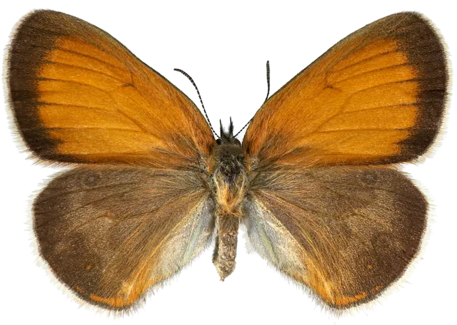 Oversiden av framvingen er guloransje med bred gråbrun ytterkant. Bakvingen er for det meste gråbrun på oversiden. Framvingens underside er brunoransje med en liten øyeflekk nær spissen, mens bakvingeundersiden er gråbrun med et bredt hvitt bånd som utad er kantet med 4-6 svart- og gulringede øyeflekker.